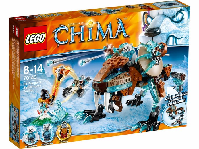 Ucieknij przed szablozębnym machiną Sir Fangara z serii LEGO® Legends of Chima™, która wyposażona jest w kłapiące szczęki, lodowe pazury, wystrzeliwane rakiety z lodowymi końcówkami oraz odłączany trójkołowiec. Machina dysponuje otwieranymi szczękami, gigantycznymi zębami, 4 wystrzeliwanymi rakietami z lodowymi końcówkami, lodowymi pazurami, ruchomymi kończynami, uchwytem na CHI, przezroczystymi niebieskimi elementami imitującymi lód, odłączanym trójkołowcem Stealthora, detalami przedstawiającymi tygrysy szablozębne oraz uchwytem na broń