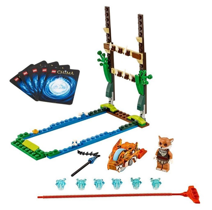 Wykonaj niesamowity skok przez całe bagno w dżungli, aby zdobyć CHI! Posadź Furty’ego na lisim Speedorze, pociągnij za linkę i przeskocz nad bagnem za ogrodzenie po drugiej stronie! Dołącz elementy dodatkowe, by zwiększyć stabilność. Zestaw zawiera minifigurkę, 2 bronie, przezroczystego Speedora, linkę, elementy dodatkowe, 6 CHI i 5 kart do gry. Wypróbuj swoją celność i refleks w grze zręcznościowej dla jednej lub większej liczby osób.