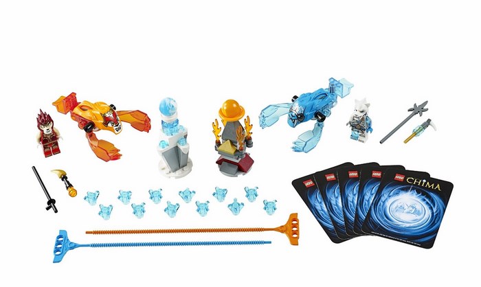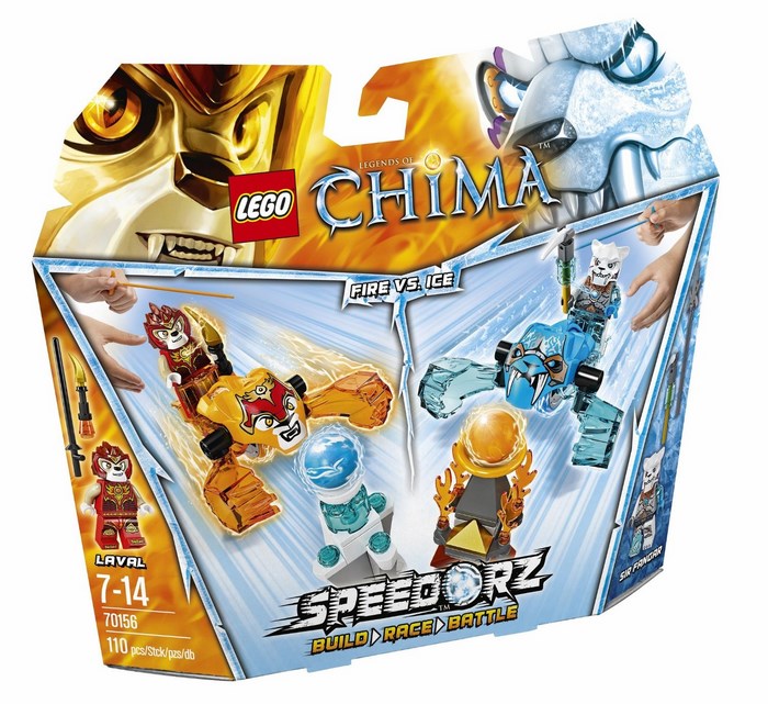Przygotuj się na ultraszybki pojedynek między dobrem a złem! Zestaw Ogień kontra lód z serii LEGO® Legends of Chima™ Speedorz™ przedstawia walkę Lavala z Sir Fangarem. Zmierz się ze znajomym, a następnie wybierz jednego przywódcę plemienia i posadź go na właściwym Speedorze. Weź na cel wieżę przeciwnika zwieńczoną totemem CHI, pociągnij linkę i ruszaj. Wygrywa osoba, która pierwsza zrzuci kulę CHI z wieży wroga! Wypróbuj swoją celność i refleks, wystrzeliwując za pomocą linki Speedory w grze zręcznościowej dla dwóch osób!