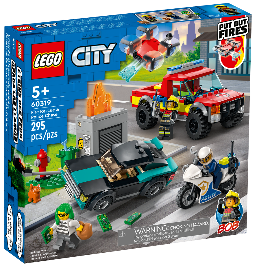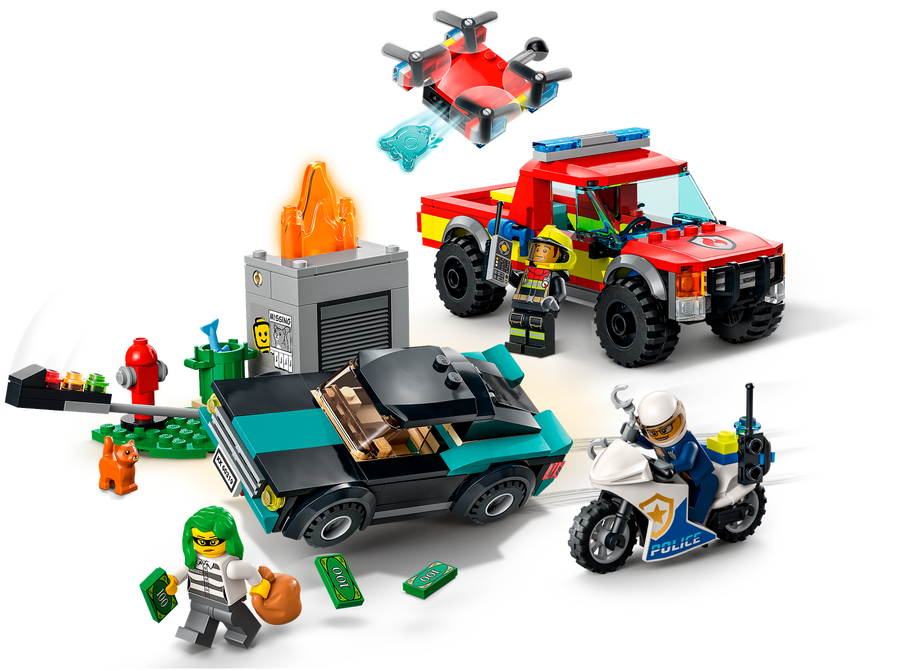- Zawartość opakowania — w środku jest strażacki pick-up z dronem, motocykl policyjny, samochód złodziejaszka, fragment pożaru z sygnalizatorem świetlnym, figurka kotka i trzy minifigurki, w tym Bob z serialu telewizyjnego LEGO® City