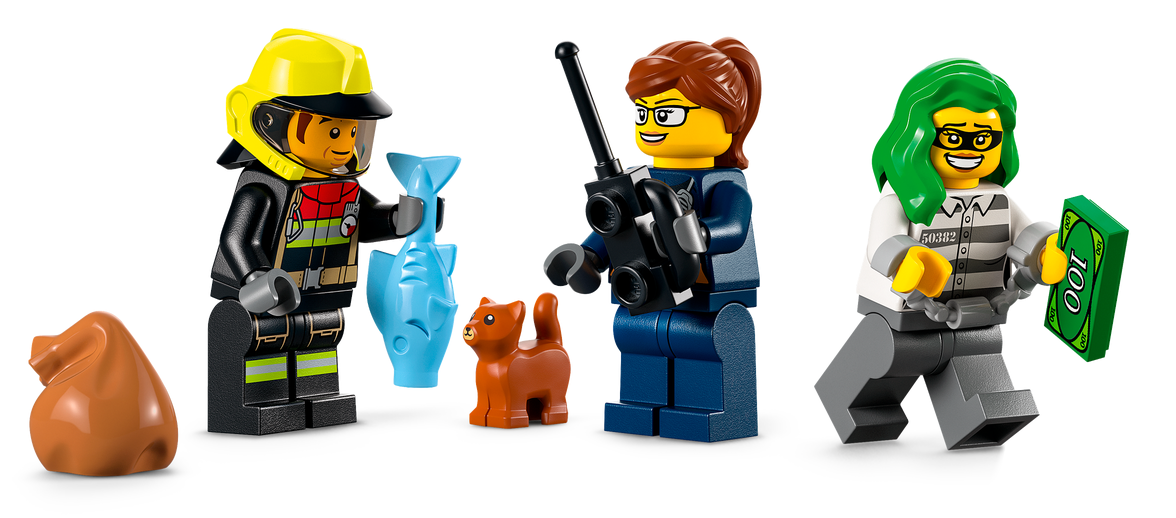 - Ciekawe akcesoria LEGO® — w zestawie znajdziesz różne akcesoria, takie jak ryba, kajdanki, dwie krótkofalówki, trzy banknoty i worek złodziejaszka
