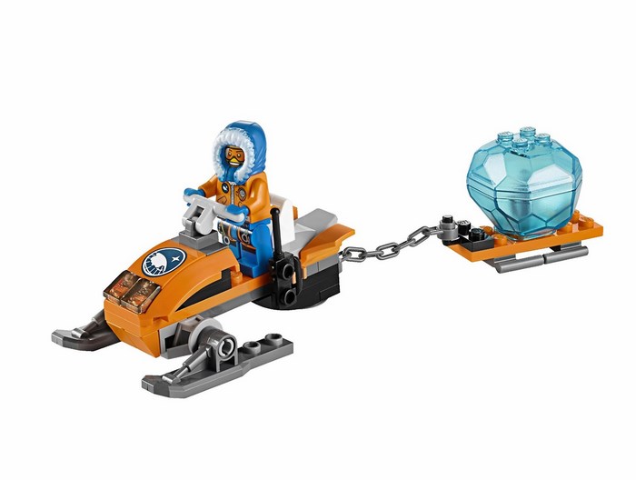 Odkrywaj tajemnice lodowej krainy na odjazdowym arktycznym skuterze śnieżnym z serii LEGO® City! Wyjedź w mroźne pustkowie razem z badaczem wyposażonym w specjalistyczny sprzęt. Rozbij kilofem wielką lodową bryłę, aby odkryć znajdujący się w środku tajemniczy kryształ. Powiadom o swoim odkryciu przez krótkofalówkę, a następnie załaduj lód oraz kryształ na sanie i wróć do bazy, aby przeprowadzić dodatkowe badania.