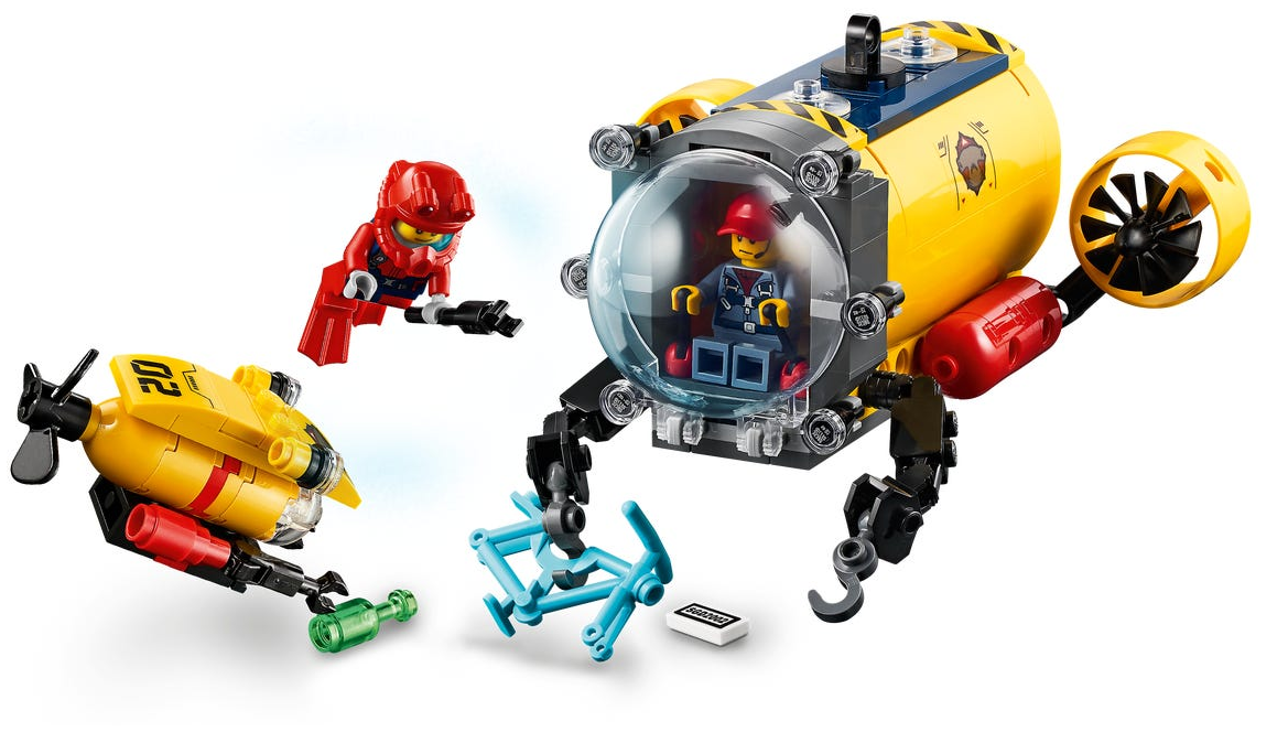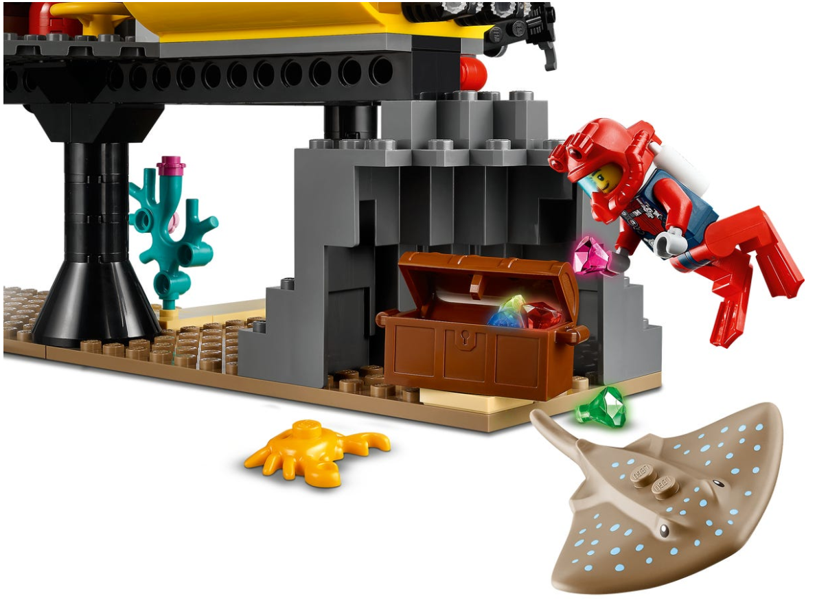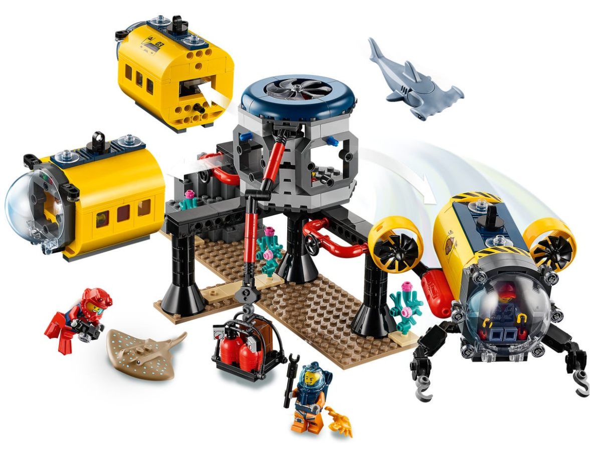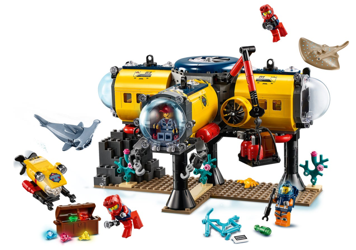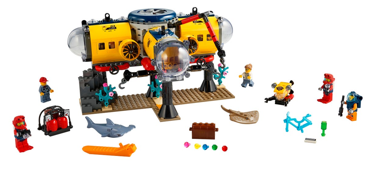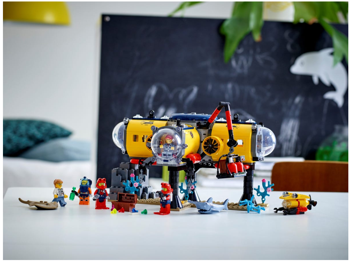 - W bazie badaczy oceanu LEGO® City dzieci znajdą wymienne moduły mieszkalny i naukowy, dokującą łódź podwodną zruchomymi ramionami badawczymi, kręcącą się śrubą i otwieranym kokpitem, w którym można posadzić dwie minifigurki.