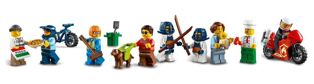 - Są tu płytki ulicy LEGO® oraz wszystkie klocki potrzebne do zbudowania pizzerii, myjni, sali treningowej, parku, stacji recyklingu, ciężarówki, samochodu elektrycznego, motocykla i roweru. Do tego osiem minifigurek, dziecko i pies przewodnik.
