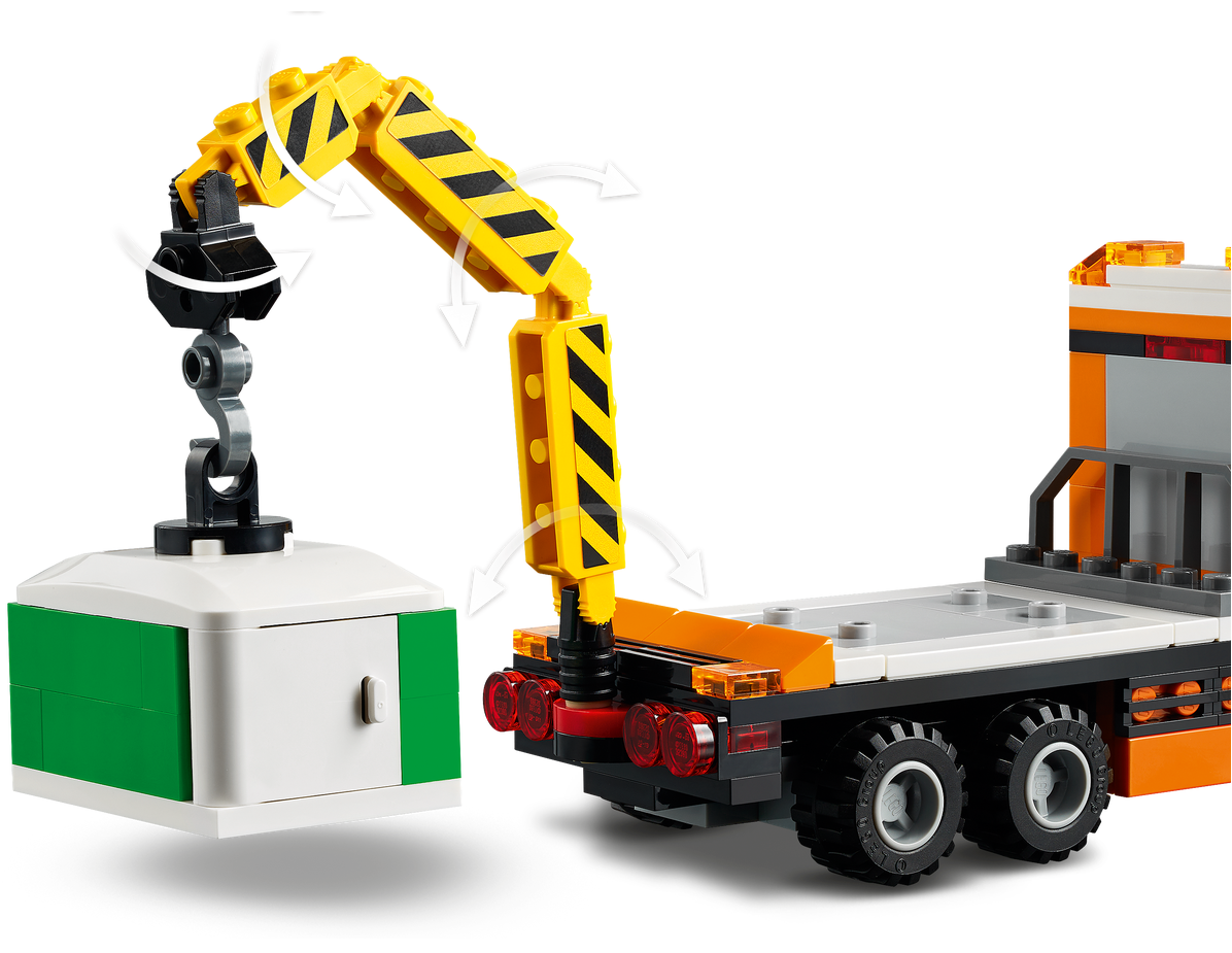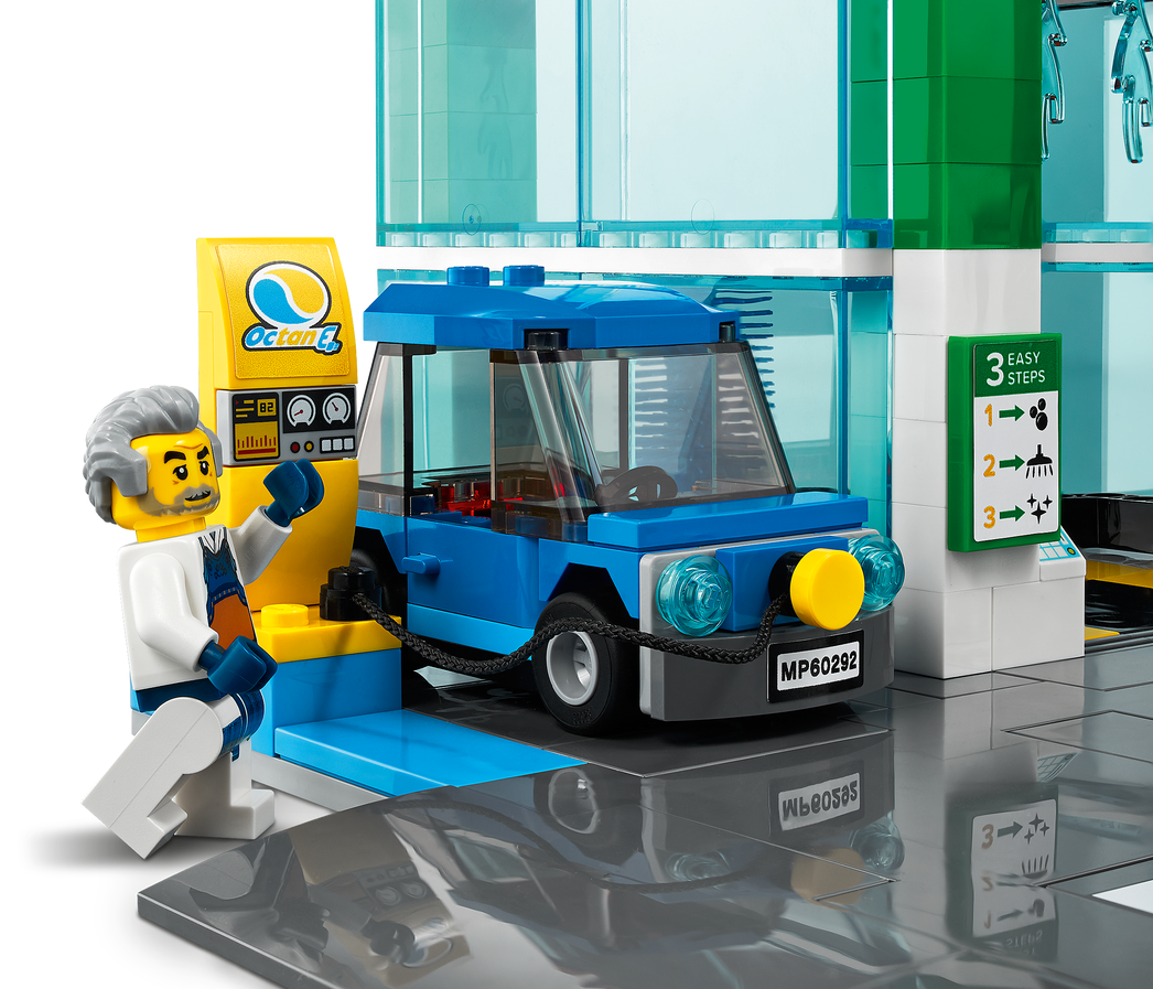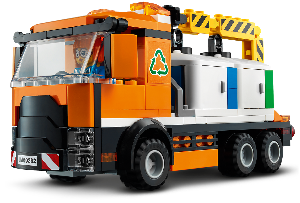 - Zestaw LEGO® sprawi, że poczujesz się jak w prawdziwym mieście. Dzieci mogą wjechać samochodami do myjni i zakręcić szczotkami, użyć dźwigu, aby załadować na ciężarówkę pojemniki z surowcami wtórnymi i robić mnóstwo innych rzeczy.