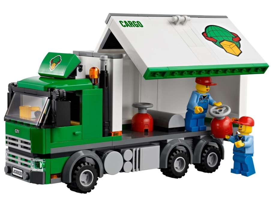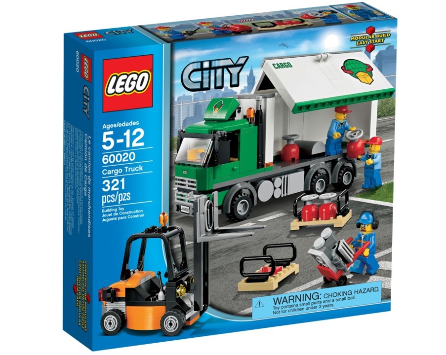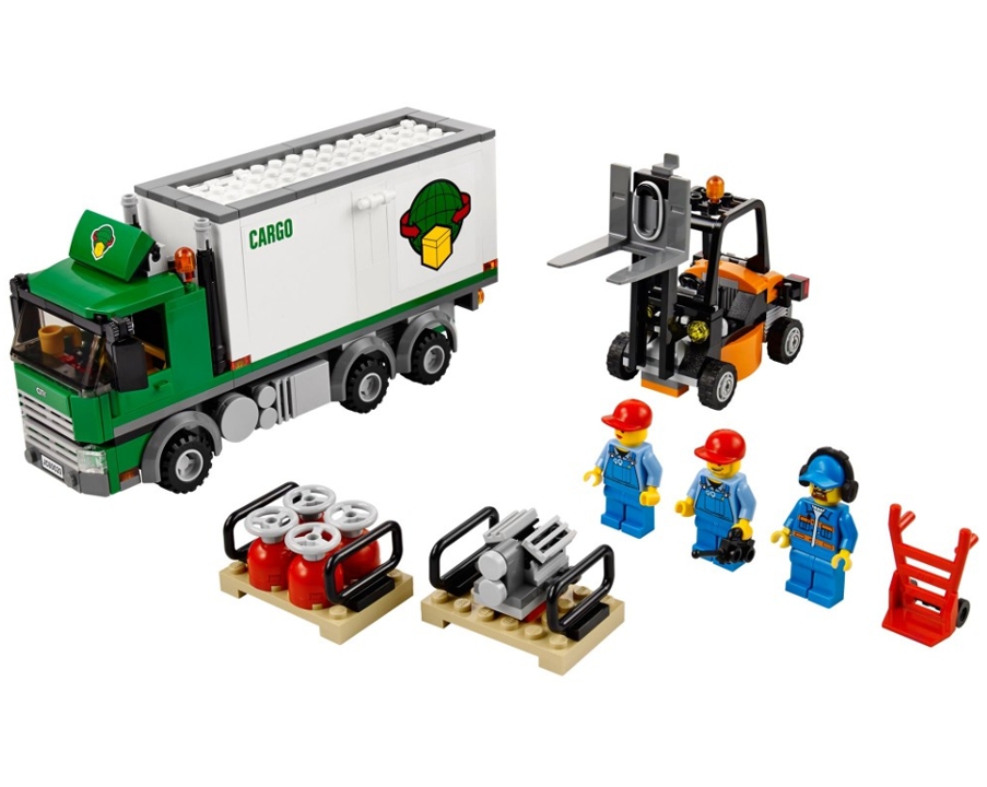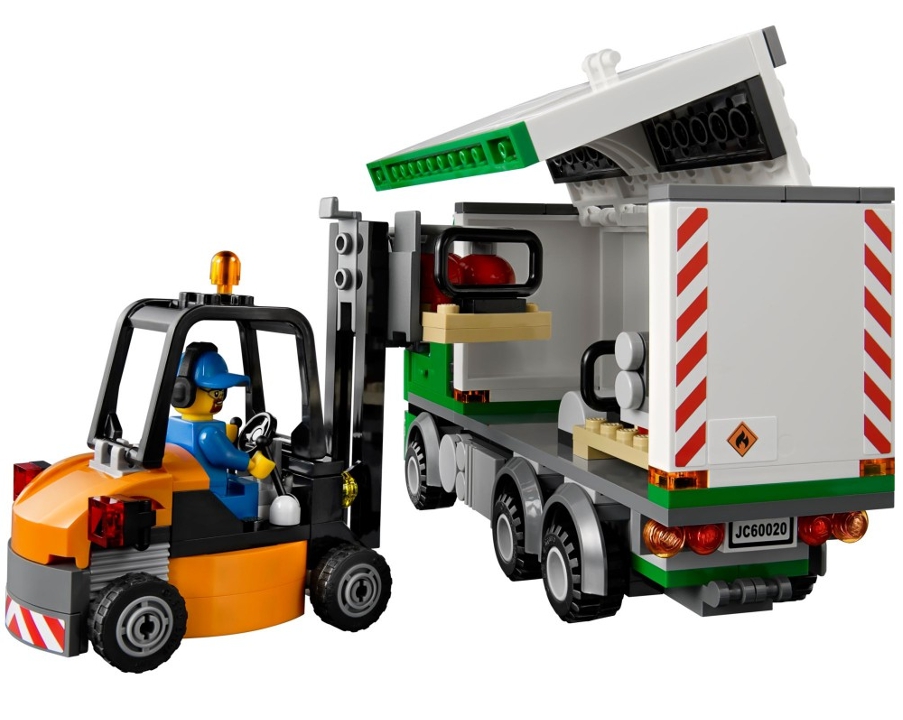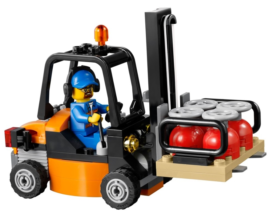 - 3 minifigurki i akcesoria: (kierowcę ciężarówki, kierowcę wózka widłowego oraz robotnika),