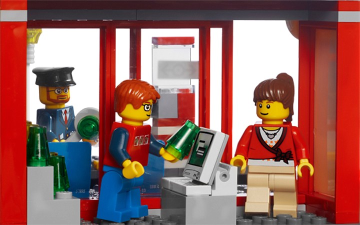 Na dworcu kolejowym LEGO City panuje spory ruch. Pasażerowie sprawdzają rozkłady jazdy, kupują bilety i wsiadają do pociągów. Dzięki kładce dla pieszych łatwo przejść nad torami na inny peron. Taksówka jest gotowa zabrać pasażera do celu.