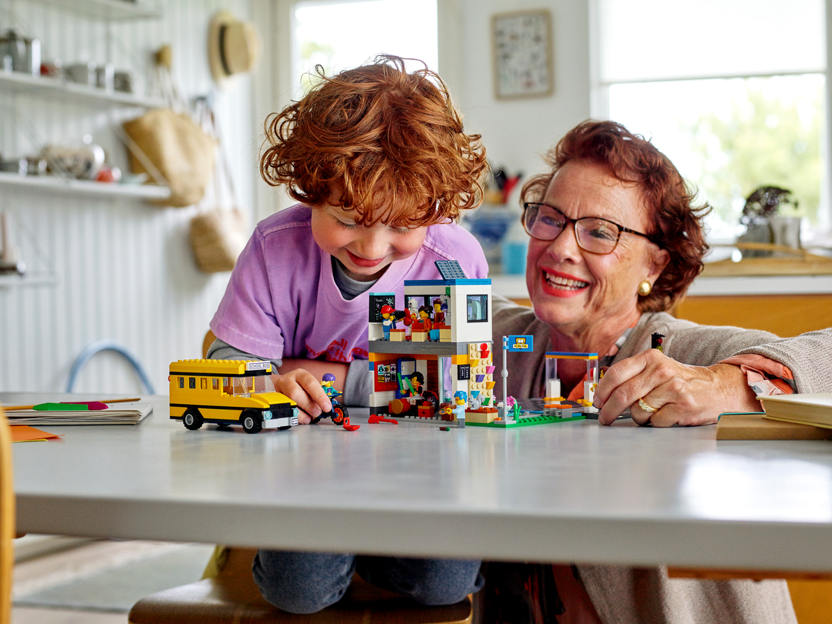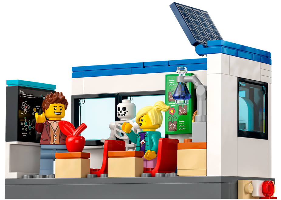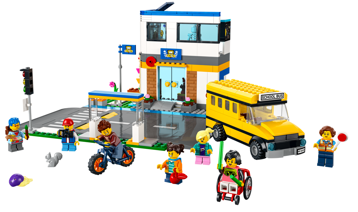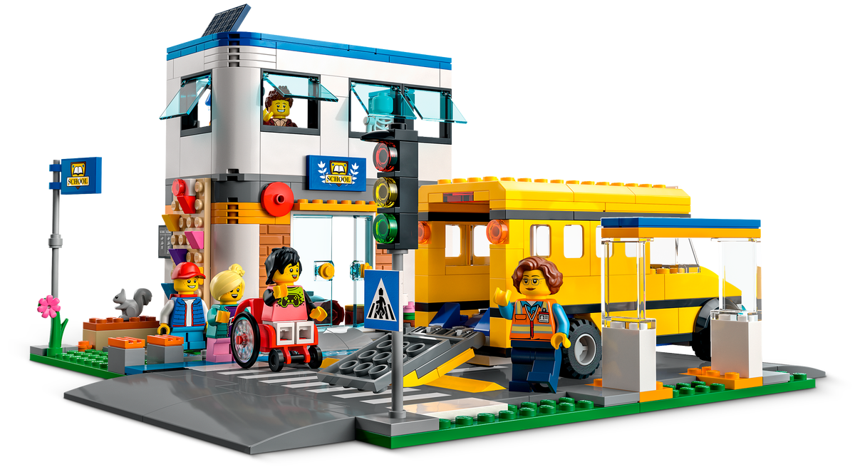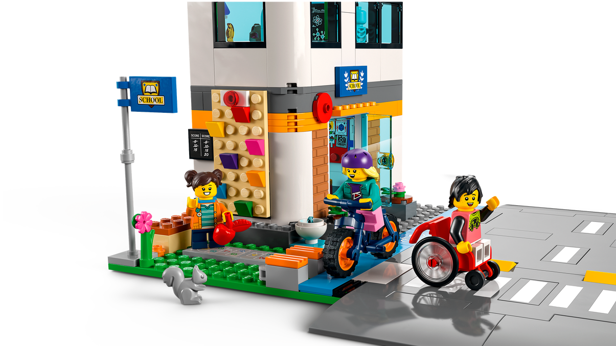 - Zawartość opakowania — w środku jest wszystko, czego dzieci potrzebują do zbudowania piętrowej szkoły z podwórkiem, autobusu szkolnego, przystanku i roweru, a także figurka wiewiórki i siedem minifigurek, w tym dwie postacie z serialu LEGO® City