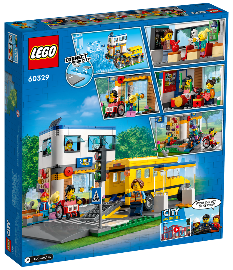 W zestawie LEGO® City Dzień w szkole (60329) czekają na Ciebie niezapomniane szkolne przygody. Budynek szkoły ma dwie sale i podwórko ze ścianką wspinaczkową oraz miejscem do grania w klasy. W komplecie jest też autobus szkolny i rower. Płytki drogowe z przejściem dla pieszych i ścieżką rowerową można połączyć z innymi zestawami LEGO, a siedem minifigurek (w tym dwie postacie z serialu telewizyjnego LEGO City Adventures) pobudza wyobraźnię i zachęca do zabawy.