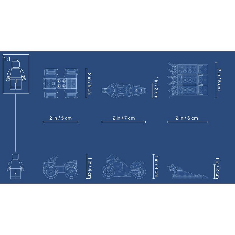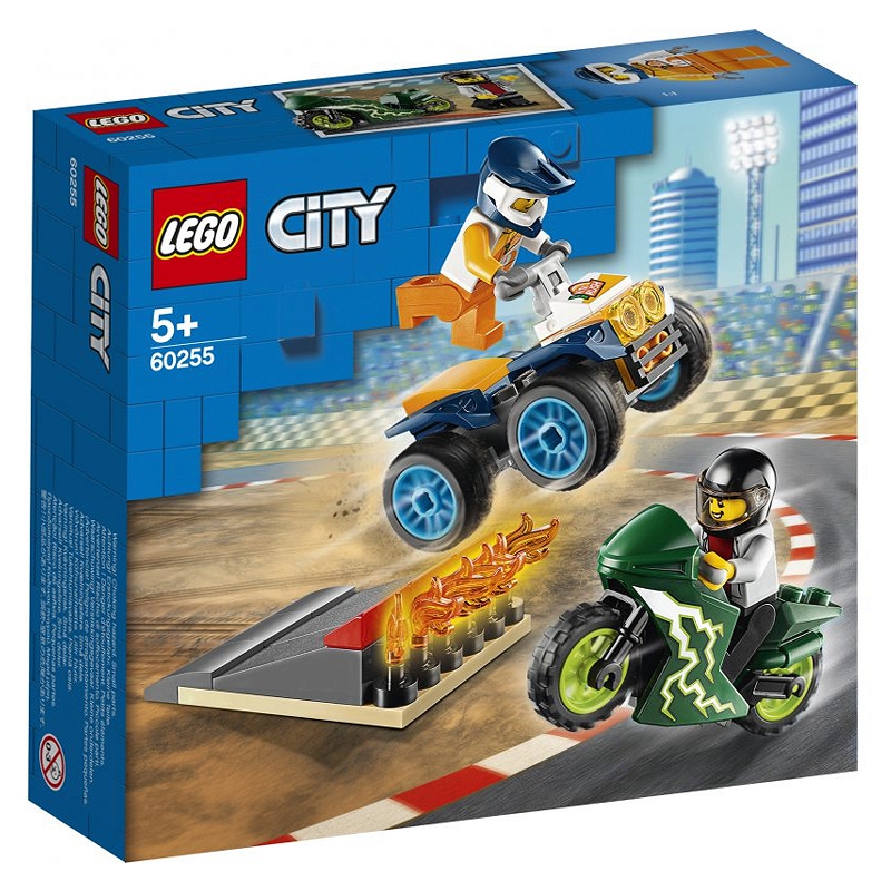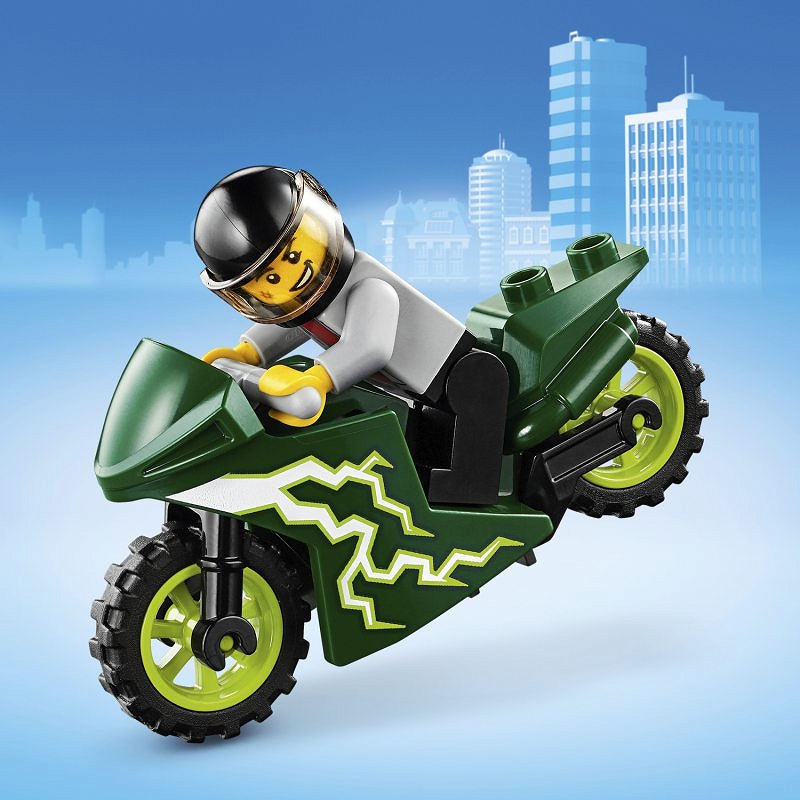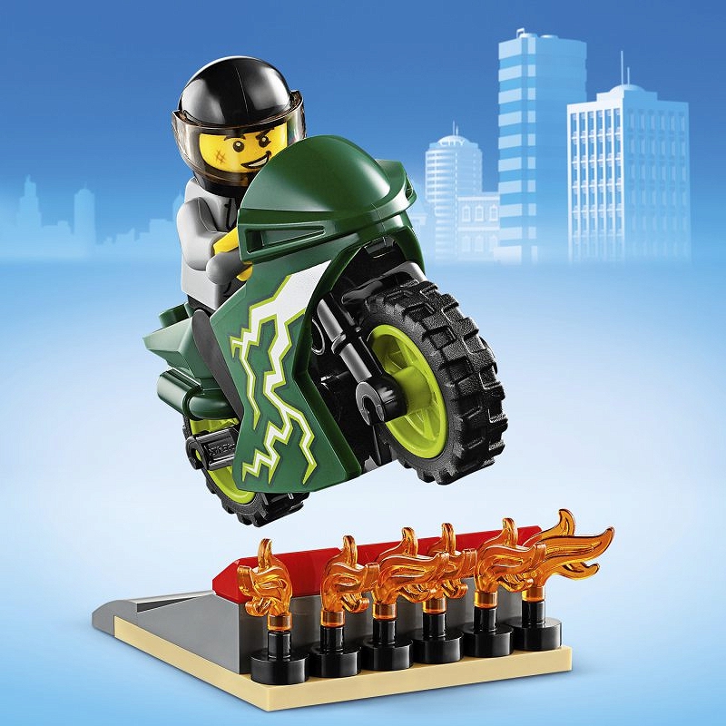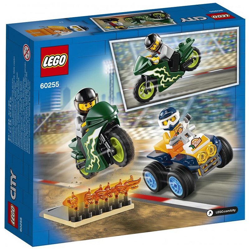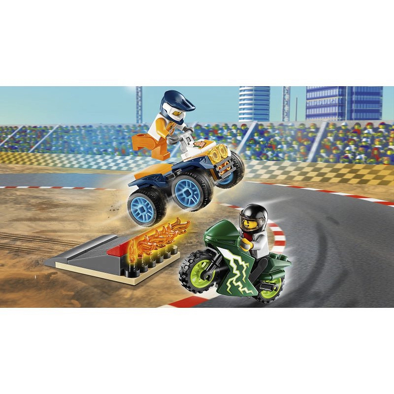 - Co jest w pudełku? Świetny motocykl i quad kaskaderski, dwie minifigurki kaskaderów w kaskach oraz płonąca rampa do skoków — wszystko, czego potrzeba do samodzielnej zabawy pełnej akcji!
