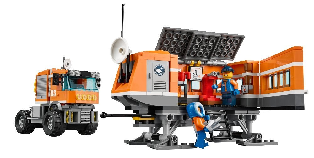 Odkrywaj tajemnice ukryte w lodzie, bawiąc się zestawem mobilna jednostka arktyczna z serii LEGO® City, w którym znajdziesz ciężarówkę, przyczepę z profesjonalnym mobilnym laboratorium oraz quada. Ciężarówka dysponuje kabiną kierowcy, licznymi światłami, obrotowym żurawiem, przezroczystą niebieską szybą przednią, masywnymi gumowymi oponami, otwieranym bagażnikiem, skrzynką z siekierką, kilofem, piłą tarczową i kluczem, a także punktami mocowania narzędzi na ściankach. Mobilne laboratorium dysponuje płozami, schodkami, otwieranym dachem i ścianką boczną, ekranami komputerowymi, mikroskopem, przezroczystymi niebieskimi ekranami, czajnikiem, kubkiem, kryształem, radarem, anteną oraz otwieranym bagażnikiem z piłą tarczową i skrzynką z narzędziami.