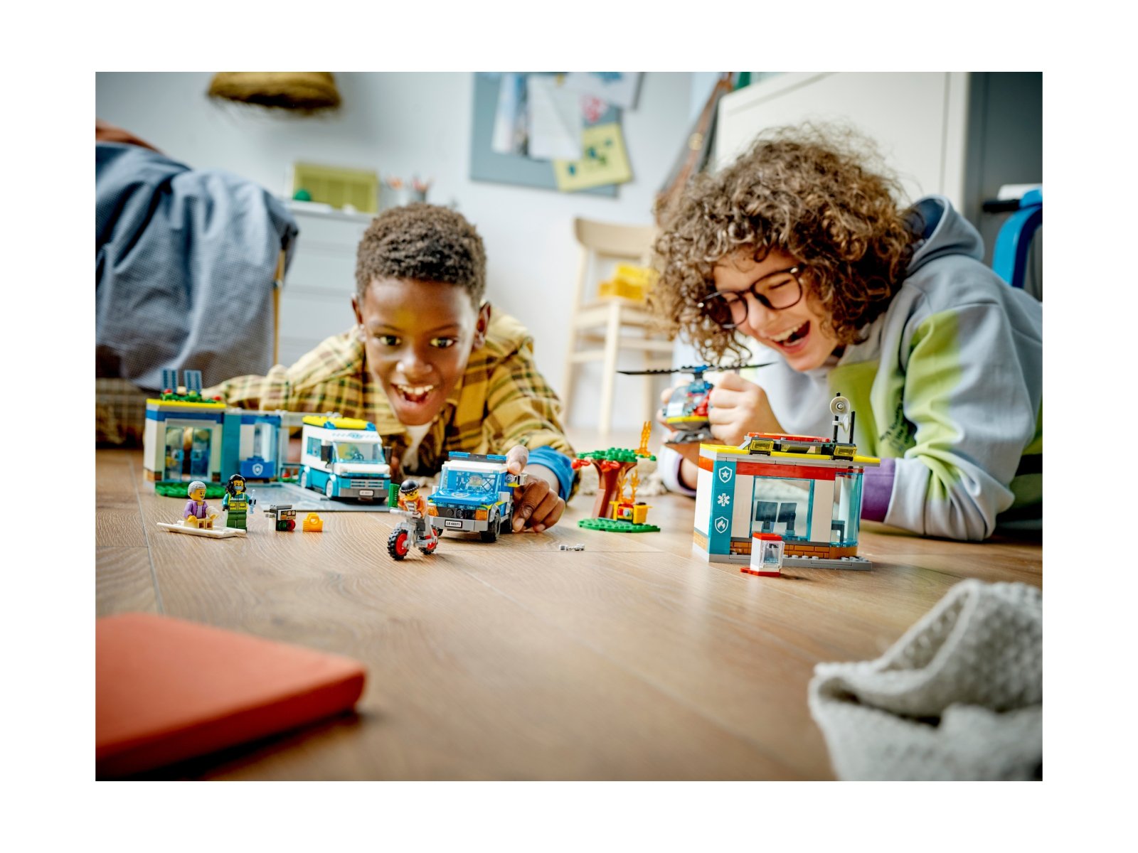 Dzięki temu zestawowi LEGO® City Parking dla pojazdów uprzywilejowanych dzieci mogą bawić się w członków ekip policyjnych, strażackich i ratunkowych. Ta dwupiętrowa siedziba służb ma wiele funkcji umożliwiających zabawę, w tym helikopter strażacki, karetkę, SUV-a policyjnego i motocykl złodziejaszka. Wystarczy dodać pięć minifigurek i można zaczynać zabawę.