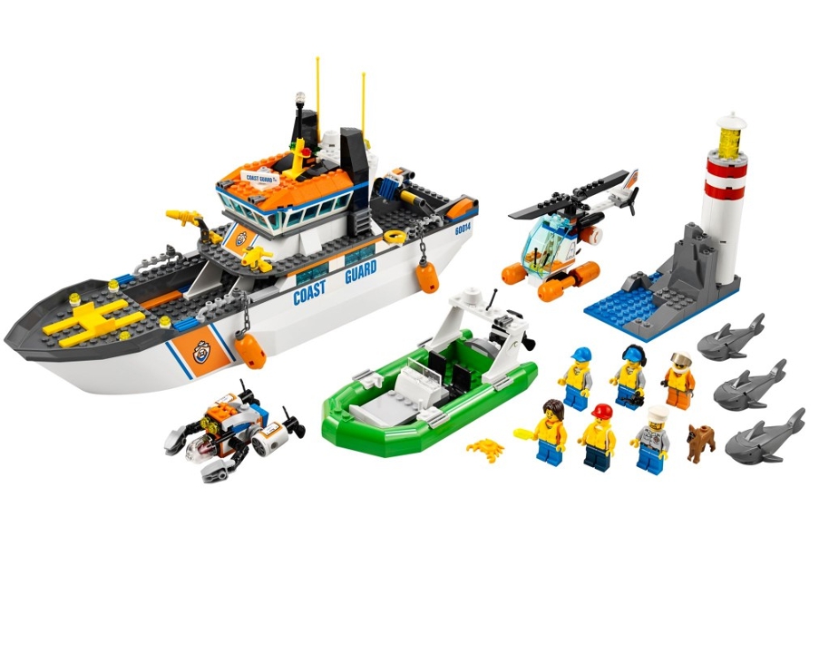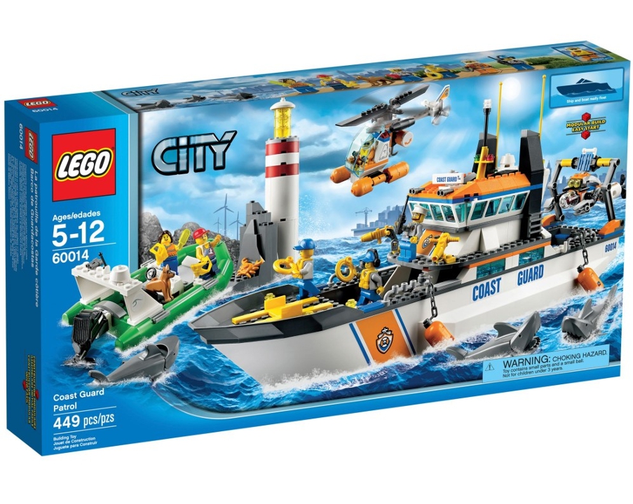 Wyrusz w kierunku latarni morskiej z patrolem straży przybrzeżnej LEGO® City! Kobieta i mężczyzna utknęli na morzu w przeciekającym pontonie, a wokół nich krążą trzy rekiny! Użyj łodzi podwodnej i helikoptera, które są transportowane na pokładzie łodzi patrolu straży przybrzeżnej, aby jak najszybciej dotrzeć na miejsce. Rzuć rozbitkom koła ratunkowe, wciągnij ich na pokład helikoptera i odstrasz rekiny za pomocą armatek wodnych!