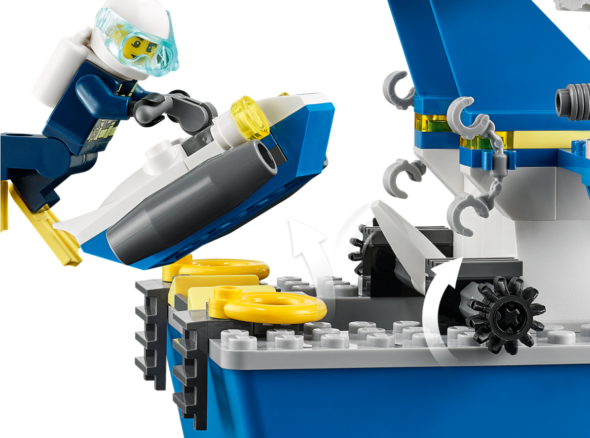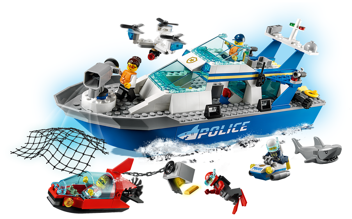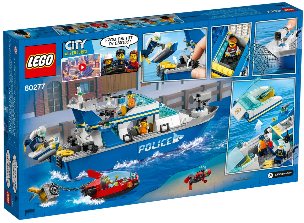 - W tym zestawie dzieci znajdą minifigurki postaci z serialu telewizyjnego LEGO® City Adventures oraz policyjną łódź patrolową, która pływa, ma mnóstwo niezwykłych detali i pozwala odtwarzać najfajniejsze sceny.