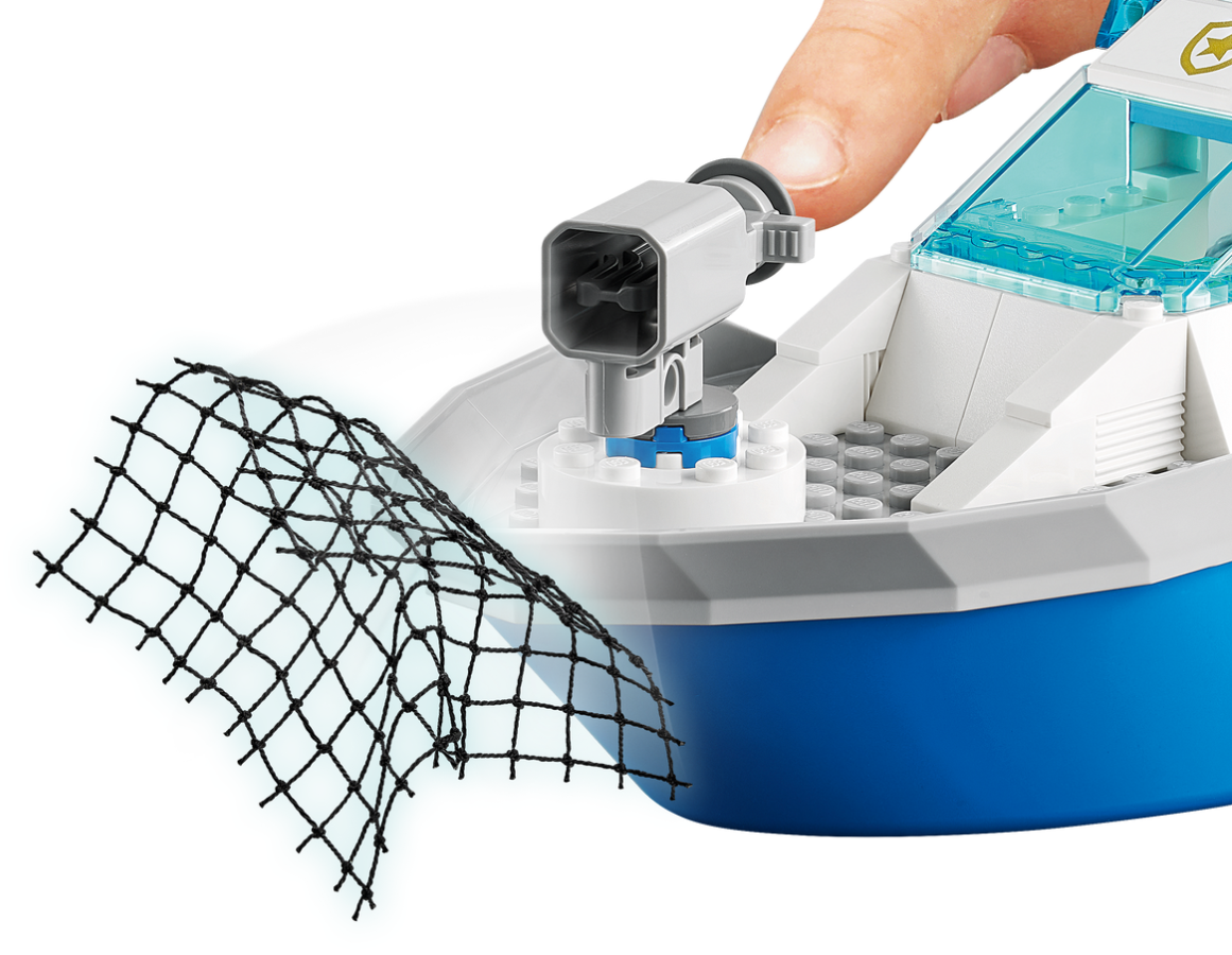 - Łódź unosi się na wodzie, pozwala złapać złodziejaszków w wystrzeliwaną sieć i ma dźwignię do wodowania skutera dla płetwonurka, więc dzieci na pewno wymyślą niejedną historię z minifigurkami postaci z serialu LEGO® City.