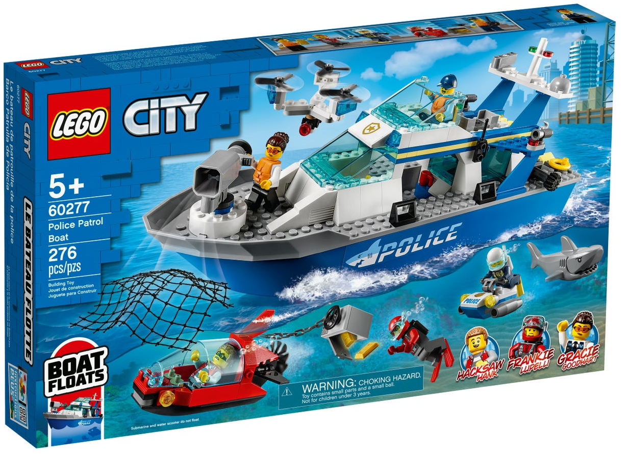 Pływająca łódź patrolowa LEGO® City (60277) jest po burty wypakowana niesamowitymi funkcjami, takimi jak szczegółowe stanowisko kontroli i dron obserwacyjny. Za pomocą dźwigni dzieci mogą zwodować nurka ze skuterem i wystrzelić siatkę, w którą zaplącze się łódź podwodna złodziejaszków. W zestawie nie brakuje inspiracji do wcielania się w różne postacie: jest tam pięć minifigurek, w tym Gracie Goodhart, Frankie Lupelli i Hacksaw Hank z serialu telewizyjnego LEGO City Adventures.