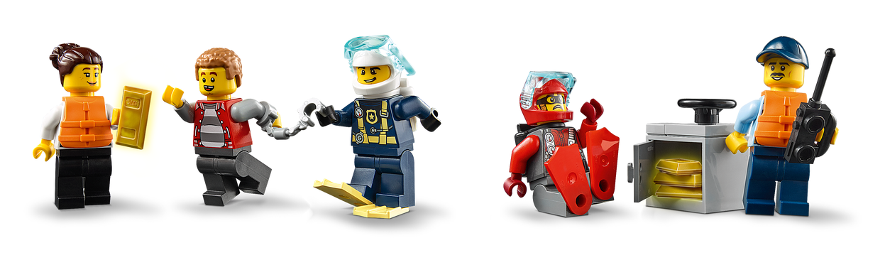 - W zestawie akcesoria LEGO®: sejf bankowy z klockami udającymi sztabki złota i sprzęt dla policyjnego płetwonurka.
