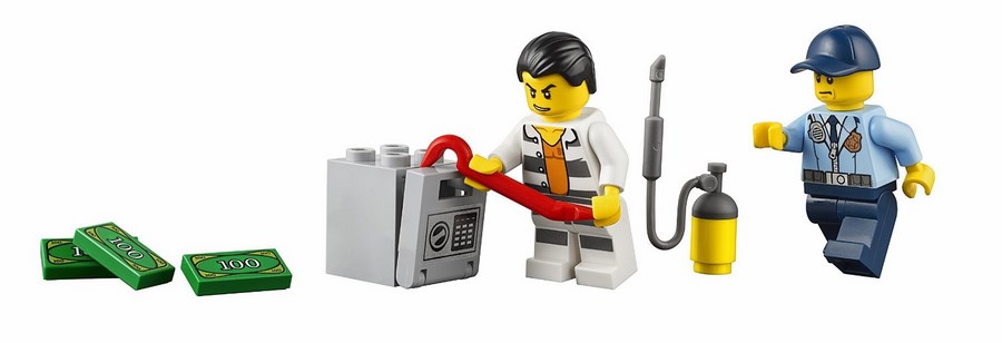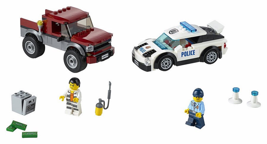Ale gratka, można przejechać się po mieście policyjnym supersamochodem! Nagle radio podaje, że komuś skradziono sejf. Za zakrętem widzisz złodzieja, który właśnie próbuje włamać się do skradzionej kasy pancernej. Będzie próbował uciec swoim pickupem — nie pozwól mu na to! Wyprzedź go, żeby ustawić blokadę z pachołków i zatrzymać przestępcę. W LEGO® City nigdy nie brakuje emocji!