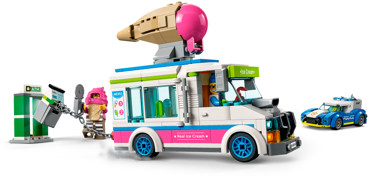 - Zawartość opakowania — w środku jest wszystko, czego dzieci potrzebują do zbudowania kolorowej furgonetki z lodami złodziejaszków, samochodu policyjnego i bankomatu, a do tego trzy minifigurki, w tym dwie postacie z serialu telewizyjnego LEGO® City