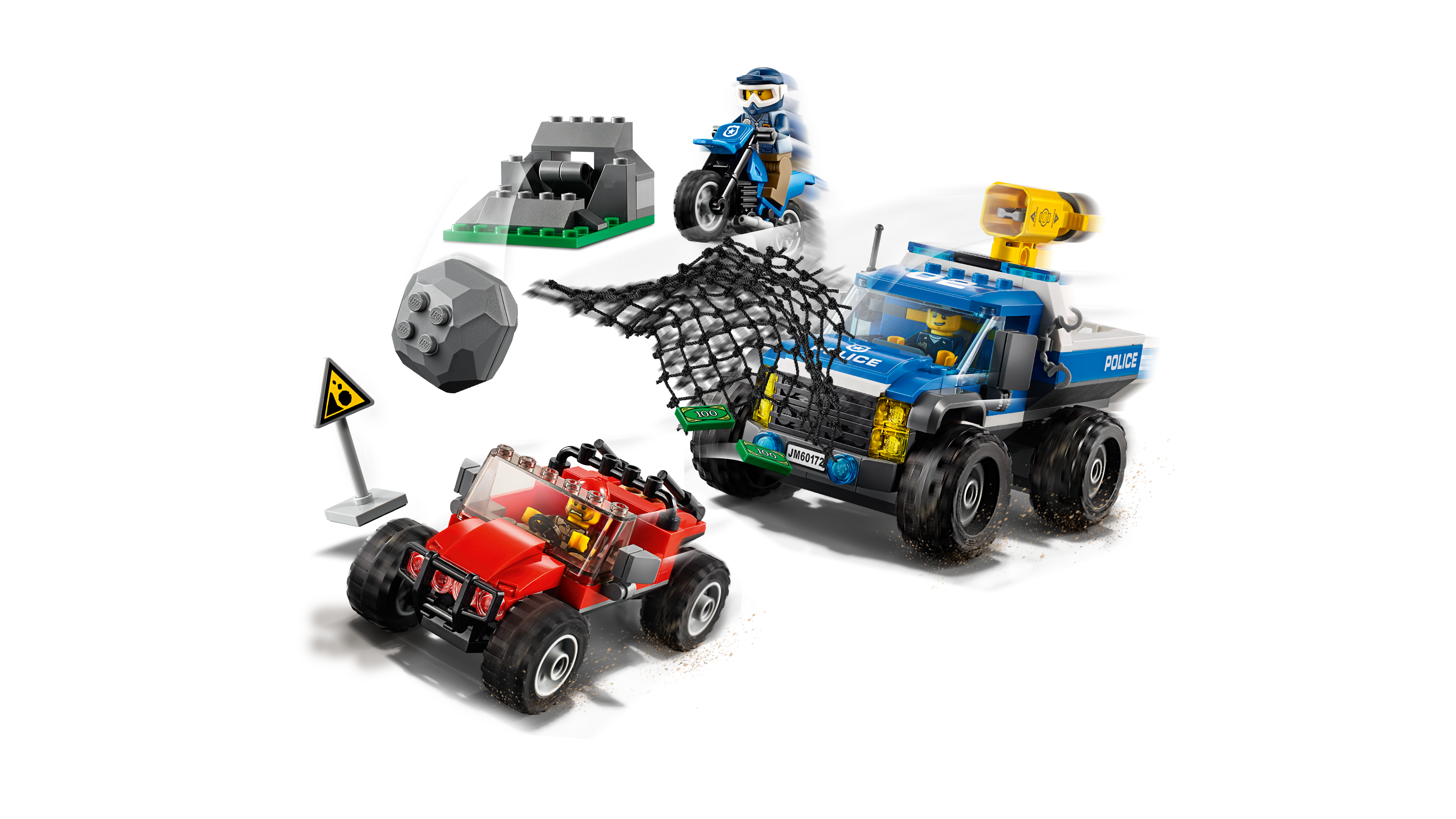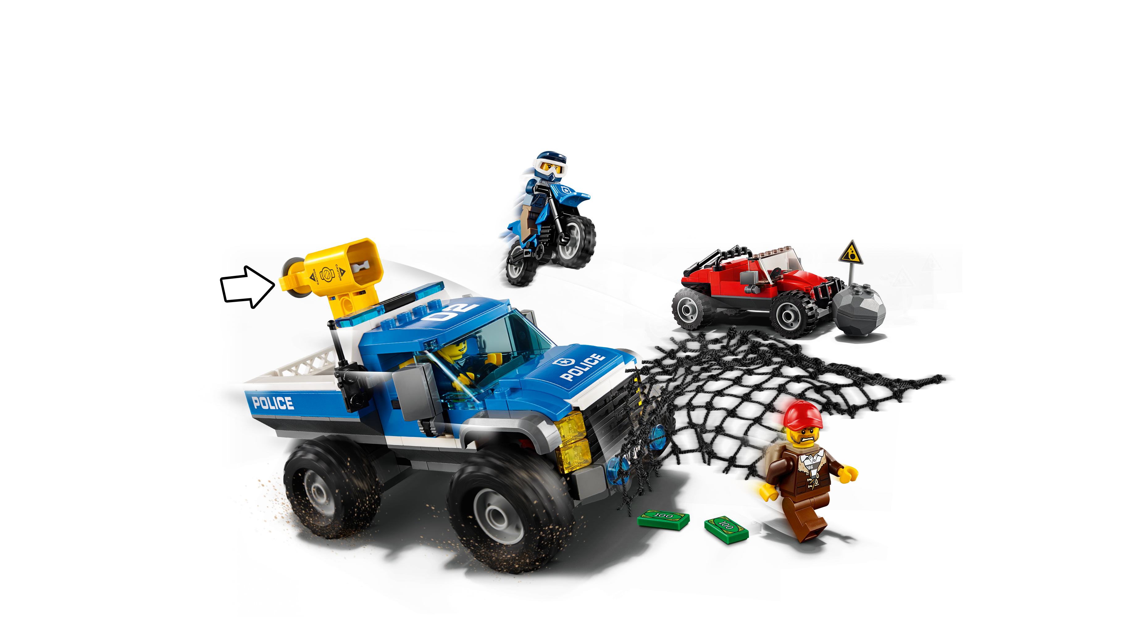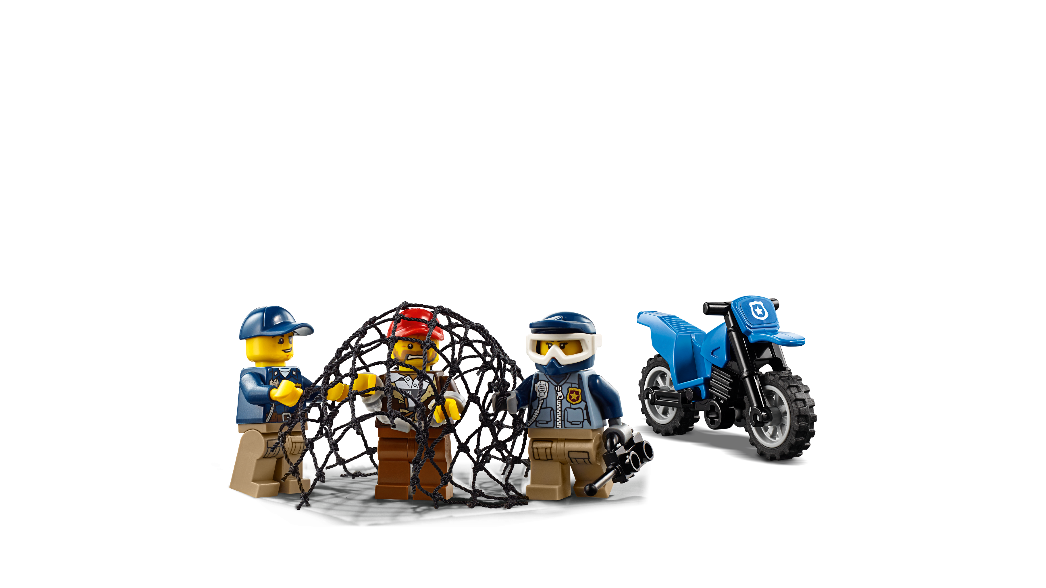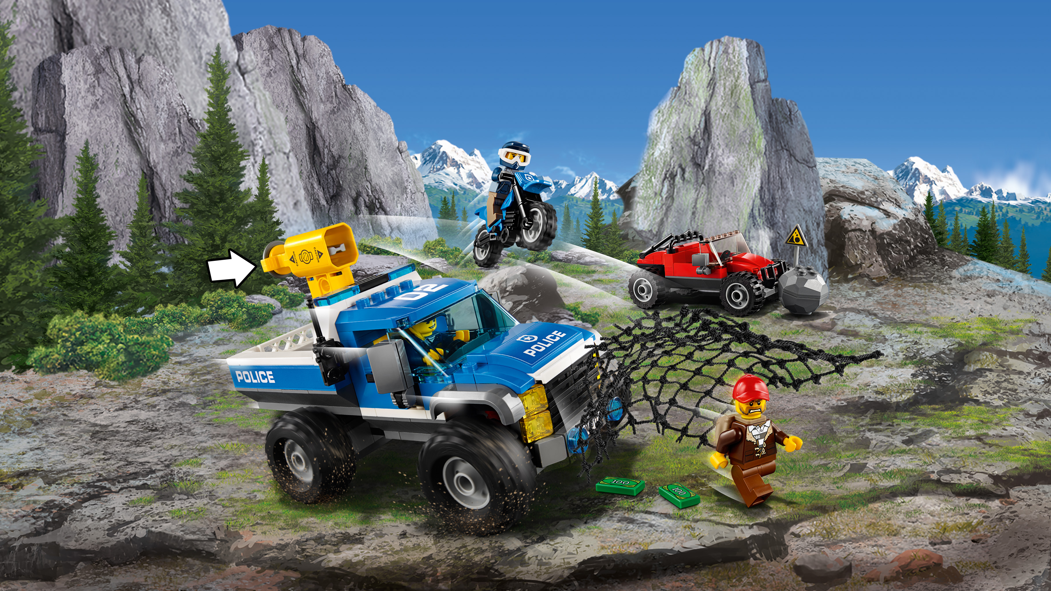 - W zestawie policyjna terenówka ze specjalnymi oponami, miejscem dla minifigurki w kabinie i wyrzutnią sieci, policyjny motocykl crossowy z nóżką, a także terenówka złoczyńców z kabiną dla minifigurki i miejscem na łupy z tyłu.