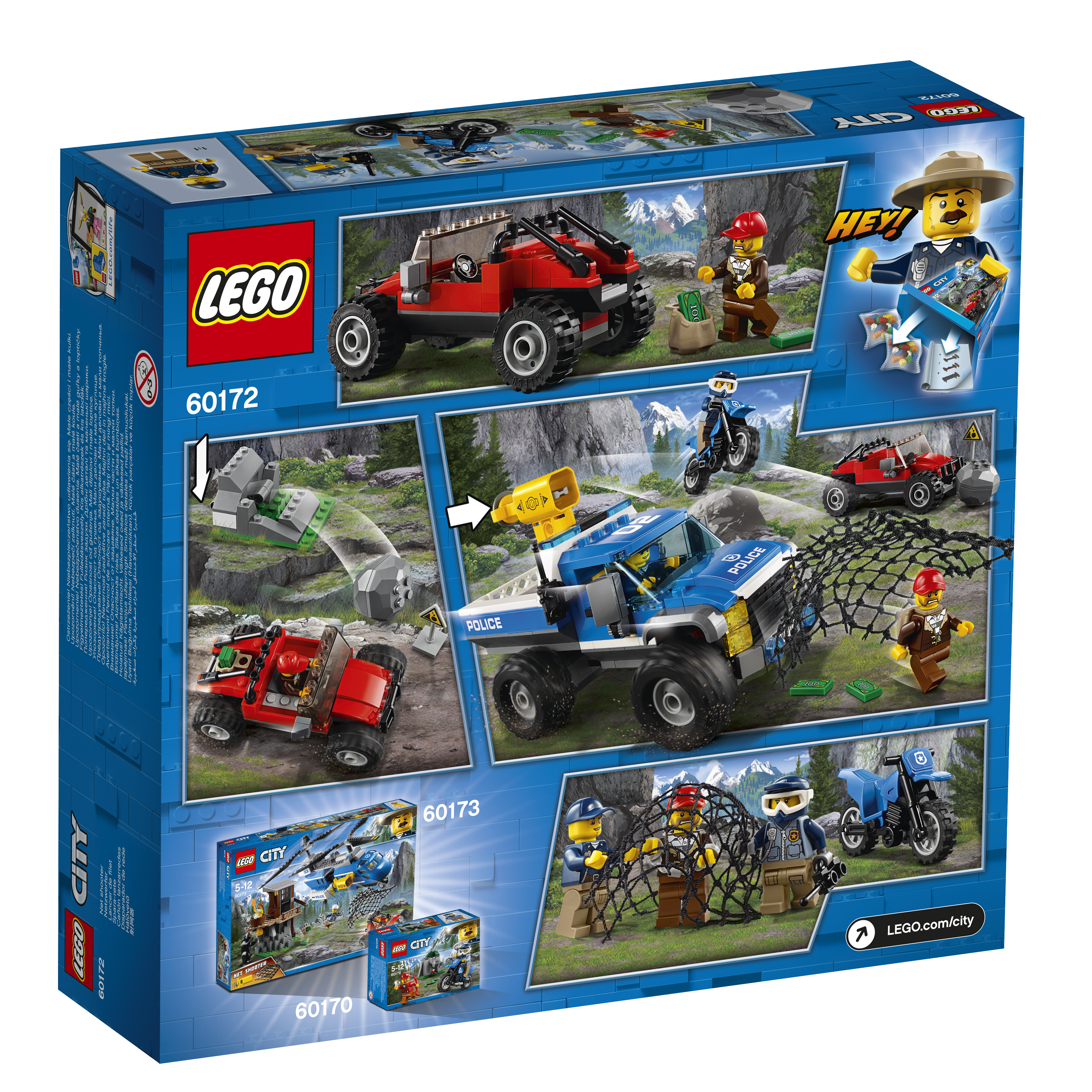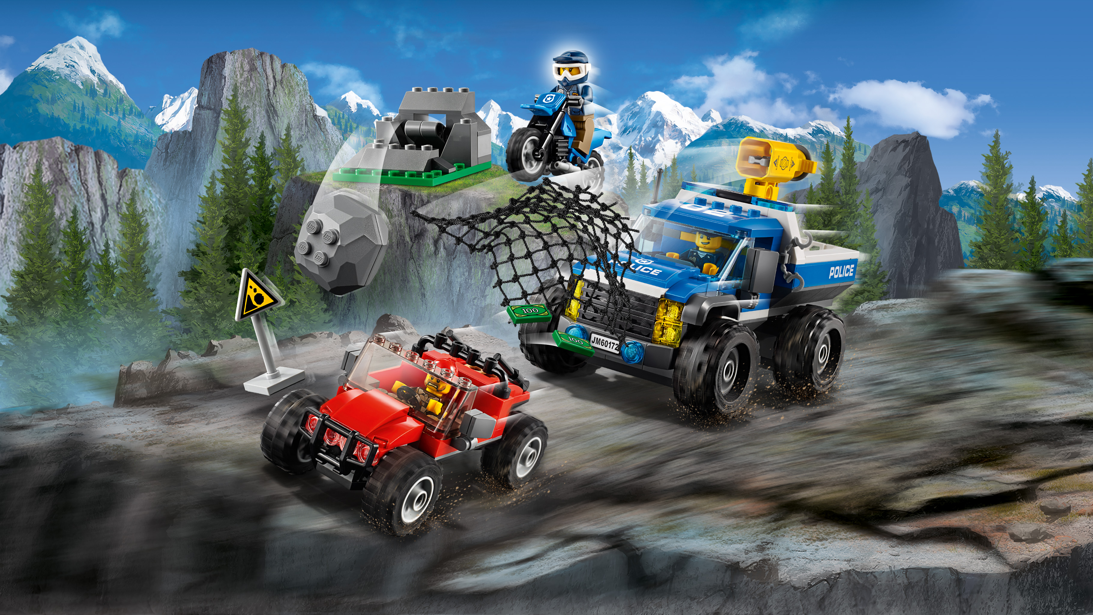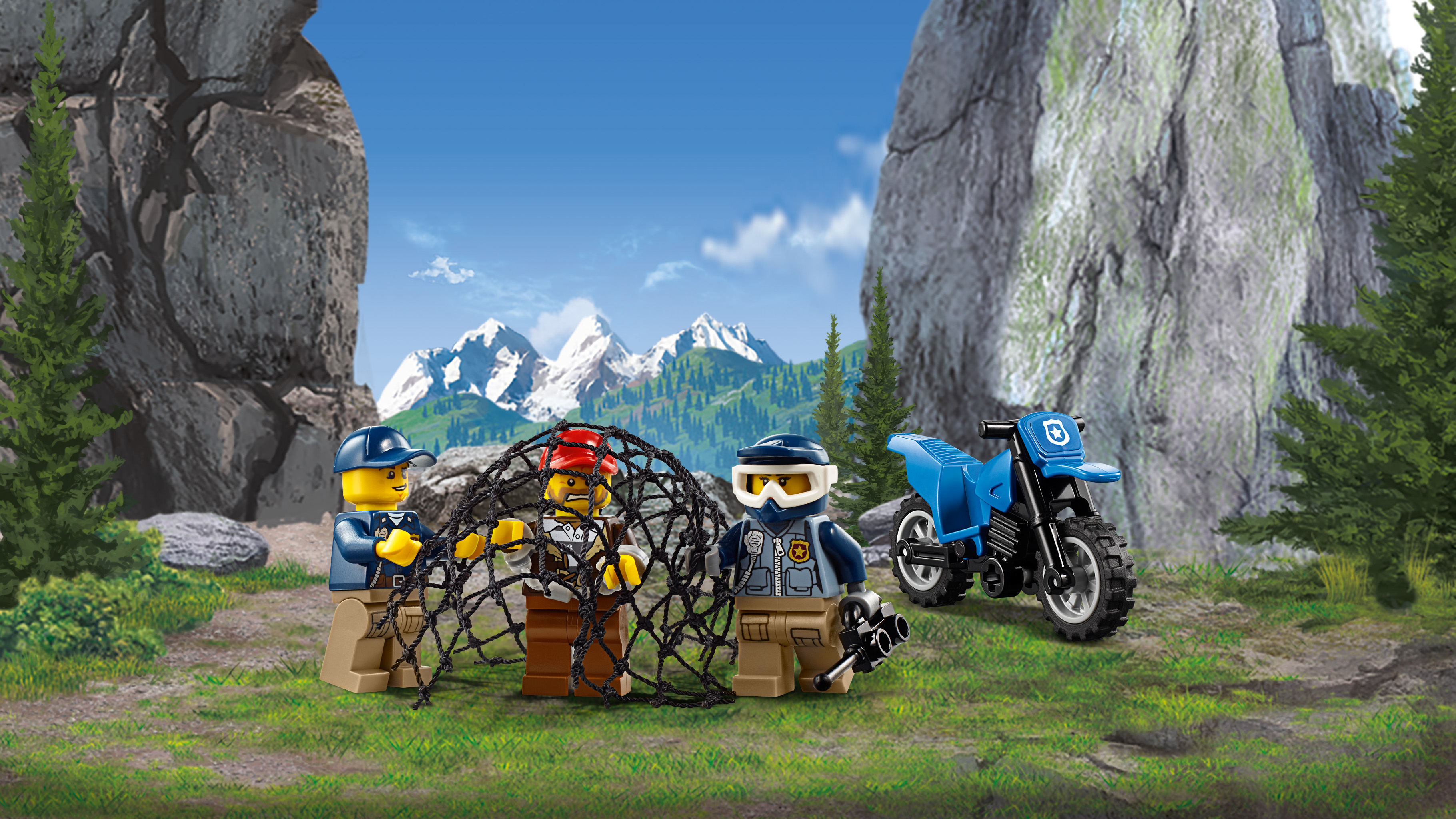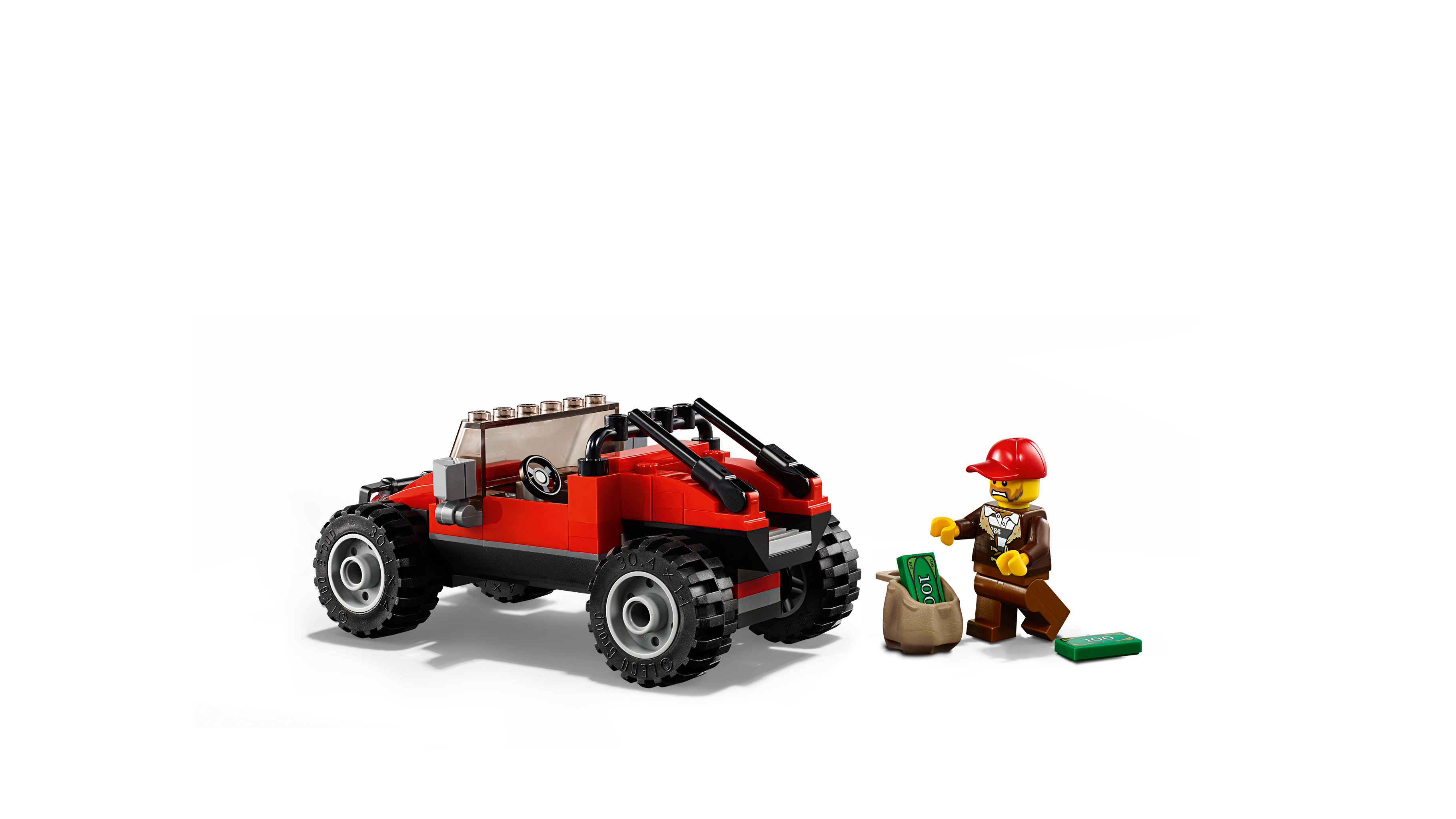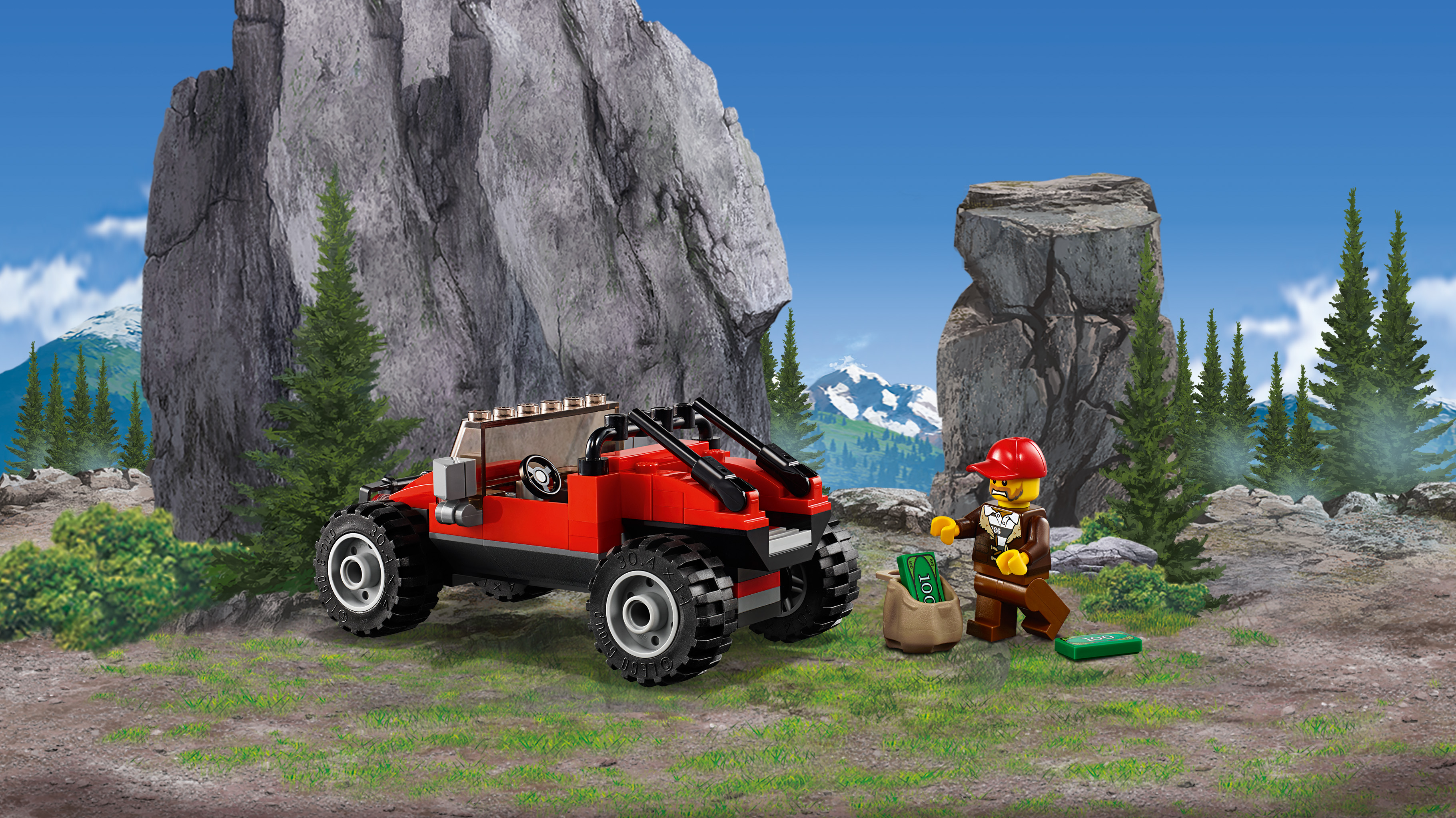 - W zestawie policyjna terenówka ze specjalnymi oponami, miejscem dla minifigurki w kabinie i wyrzutnią sieci, policyjny motocykl crossowy z nóżką, a także terenówka złoczyńców z kabiną dla minifigurki i miejscem na łupy z tyłu.