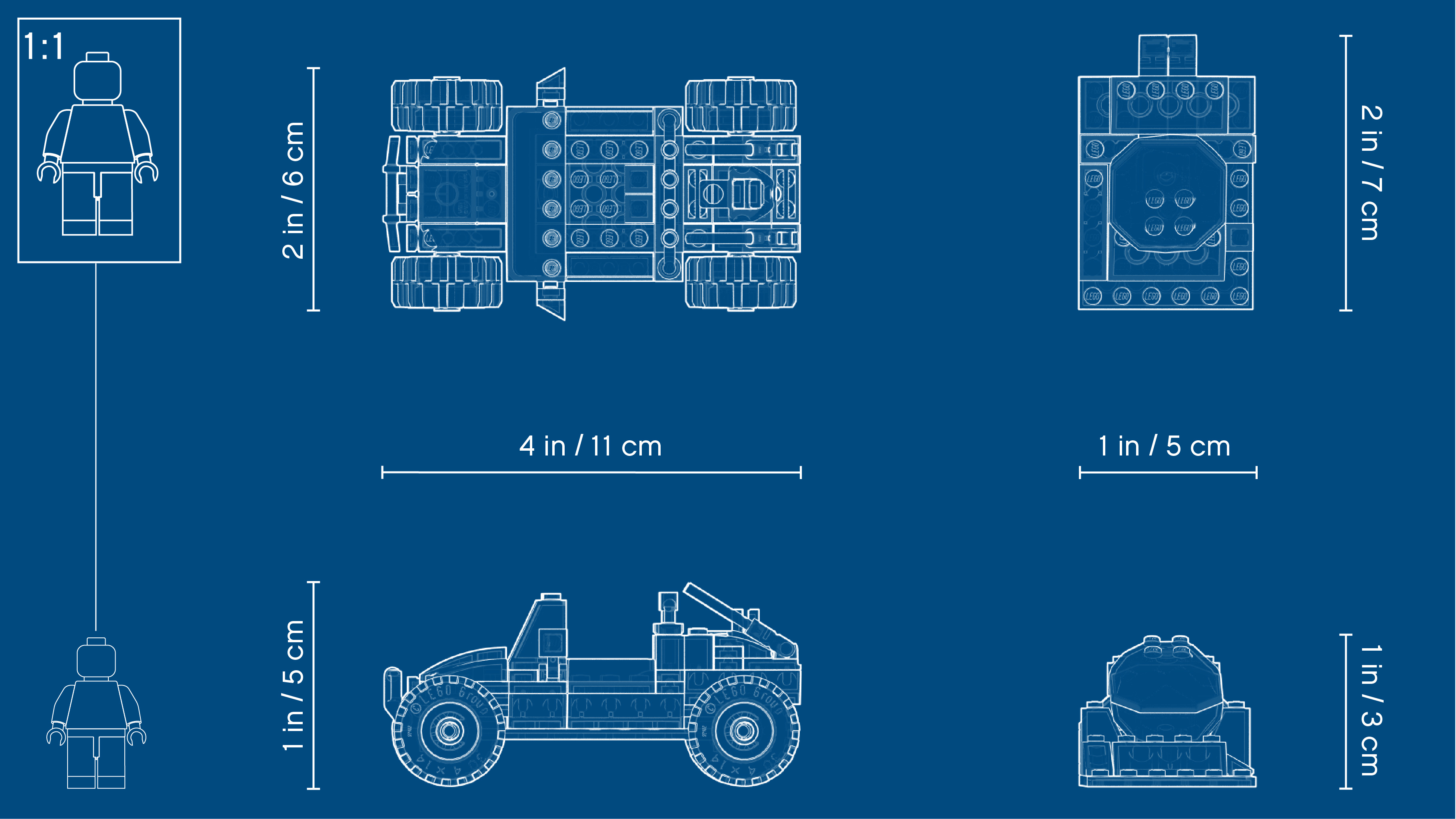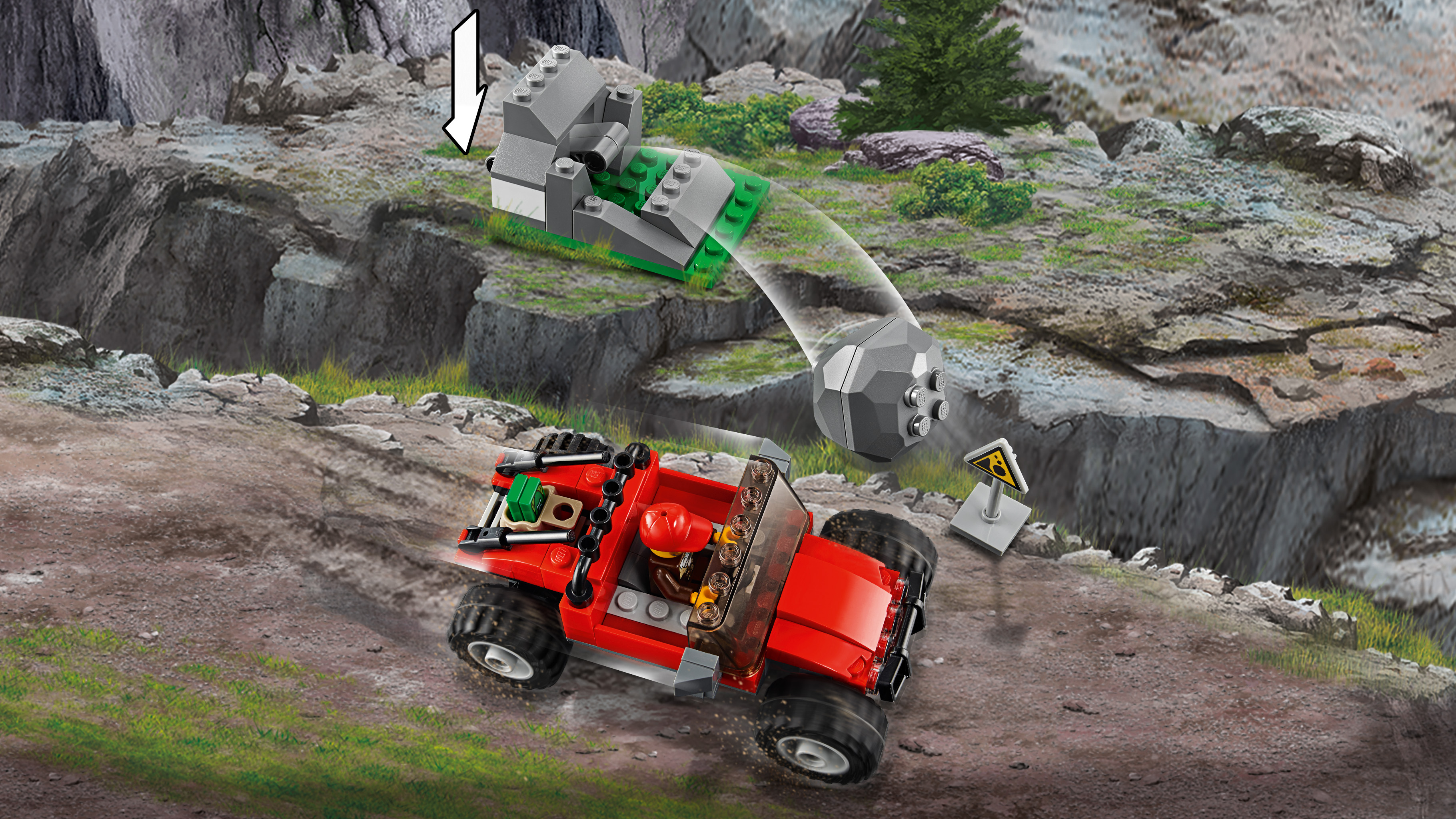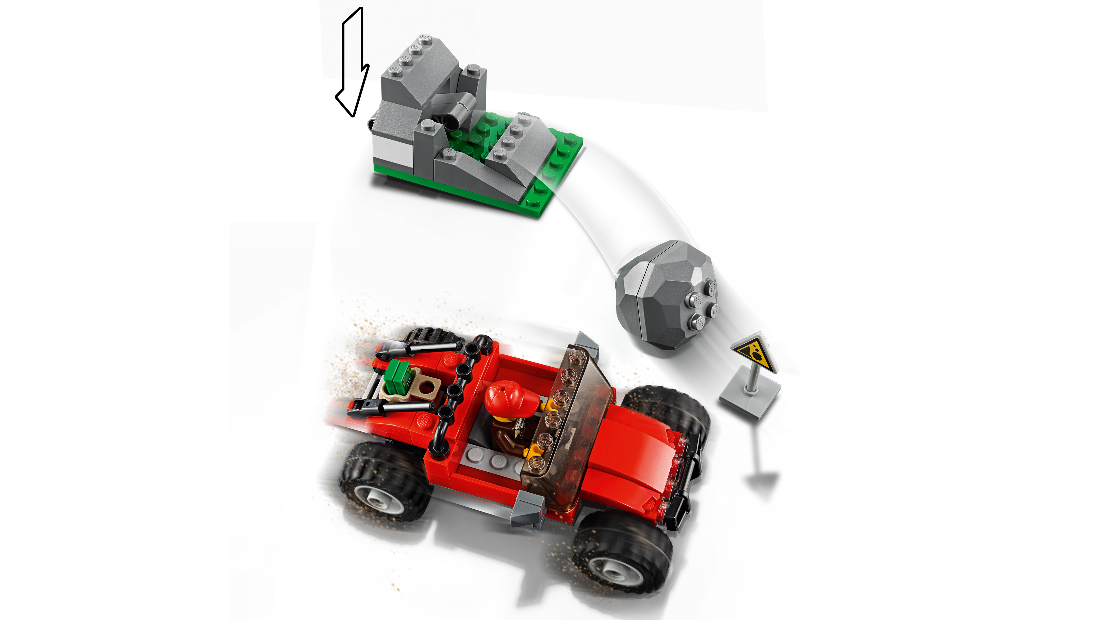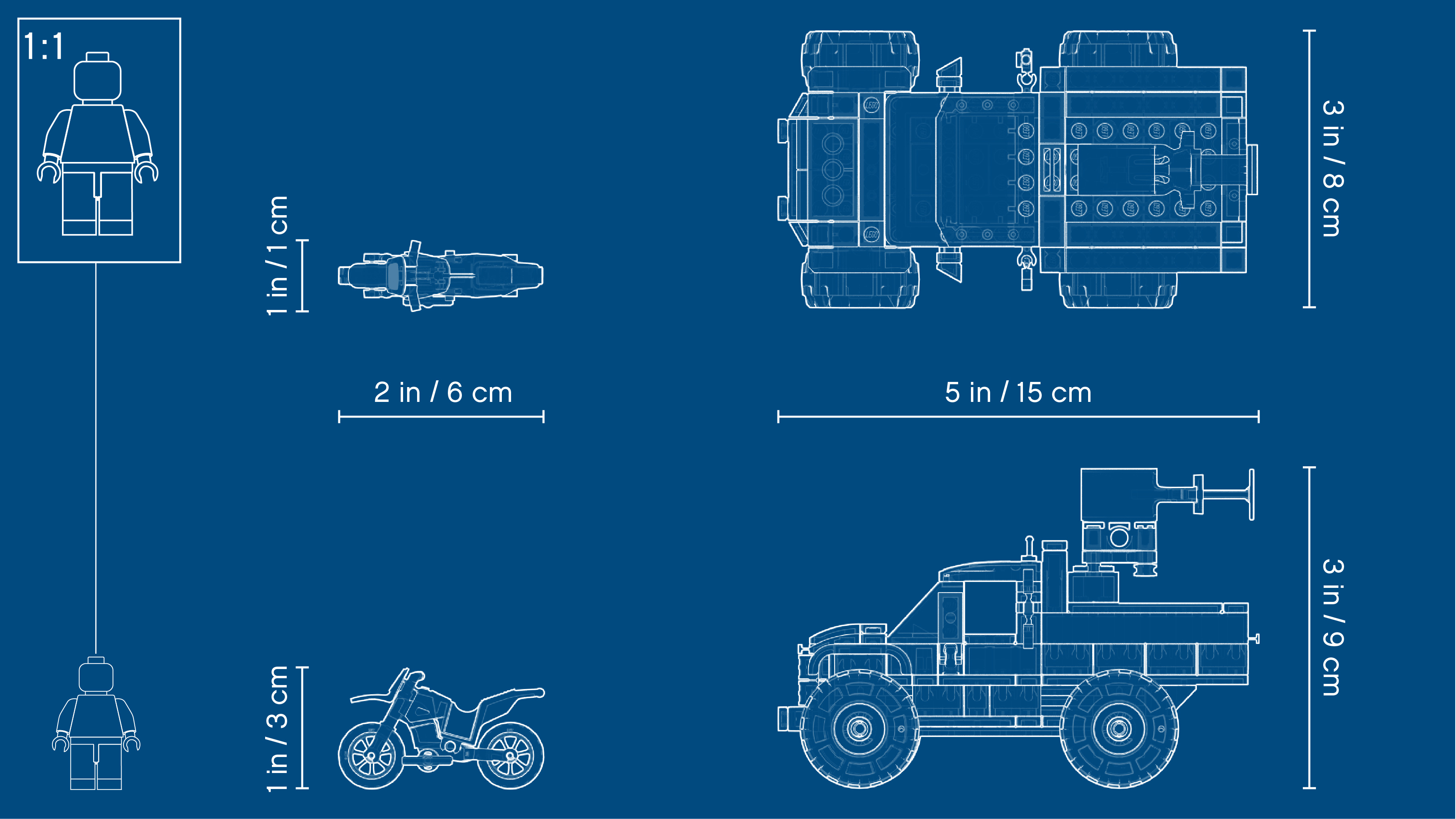 - W zestawie policyjna terenówka ze specjalnymi oponami, miejscem dla minifigurki w kabinie i wyrzutnią sieci, policyjny motocykl crossowy z nóżką, a także terenówka złoczyńców z kabiną dla minifigurki i miejscem na łupy z tyłu.
