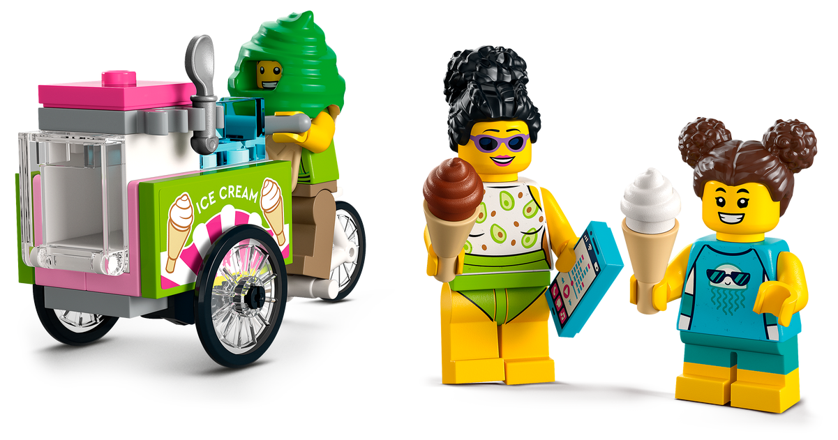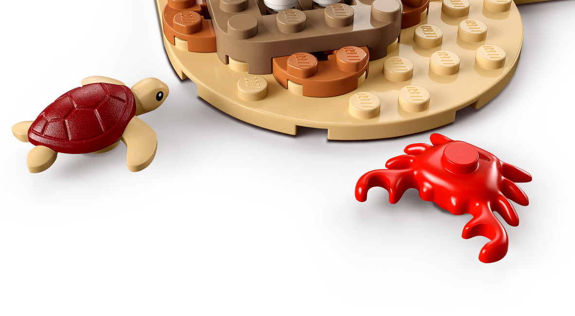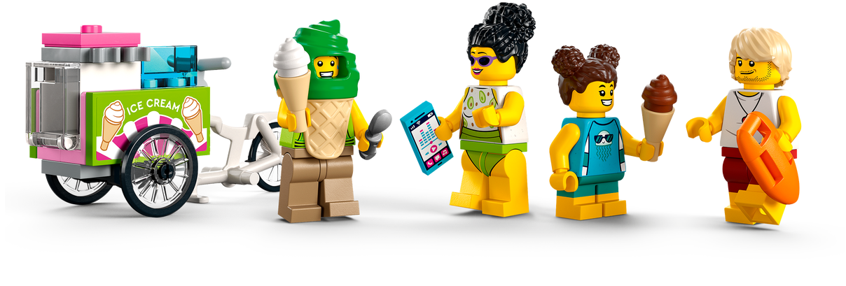 - Zawartość opakowania — w środku jest wszystko, czego dzieci potrzebują do zbudowania piętrowego stanowiska ratowniczego, quada, wózka z lodami i fragmentu plaży z palmą, a także cztery minifigurki oraz figurki kraba i żółwia