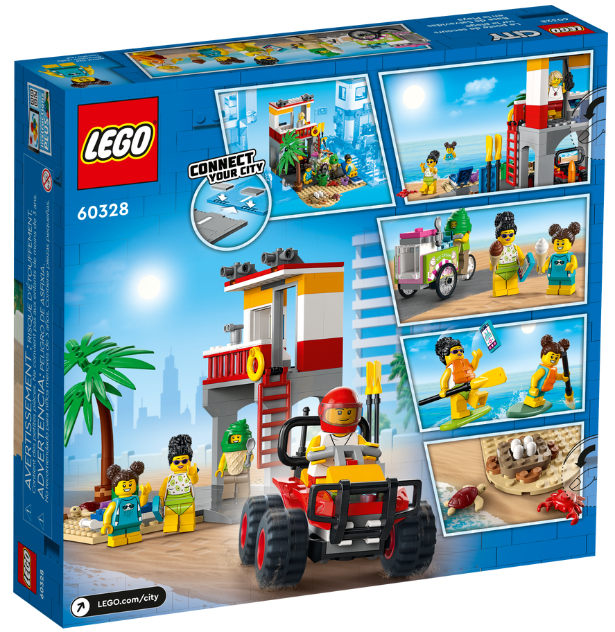 Z zestawem LEGO® City Stanowisko ratownicze na plaży (60328) nigdy nie zabraknie Ci słońca. W środku znajdziesz piętrowy budynek z centrum dowodzenia i mnóstwem sprzętu ratunkowego — w tym fenomenalnym quadem. Dzieci mogą też pobawić się kolorowym wózkiem z lodami i fragmentem plaży z płytką drogową, którą można połączyć z innymi zestawami LEGO. Całości dopełnia żółw w gnieździe, krab i cztery minifigurki.