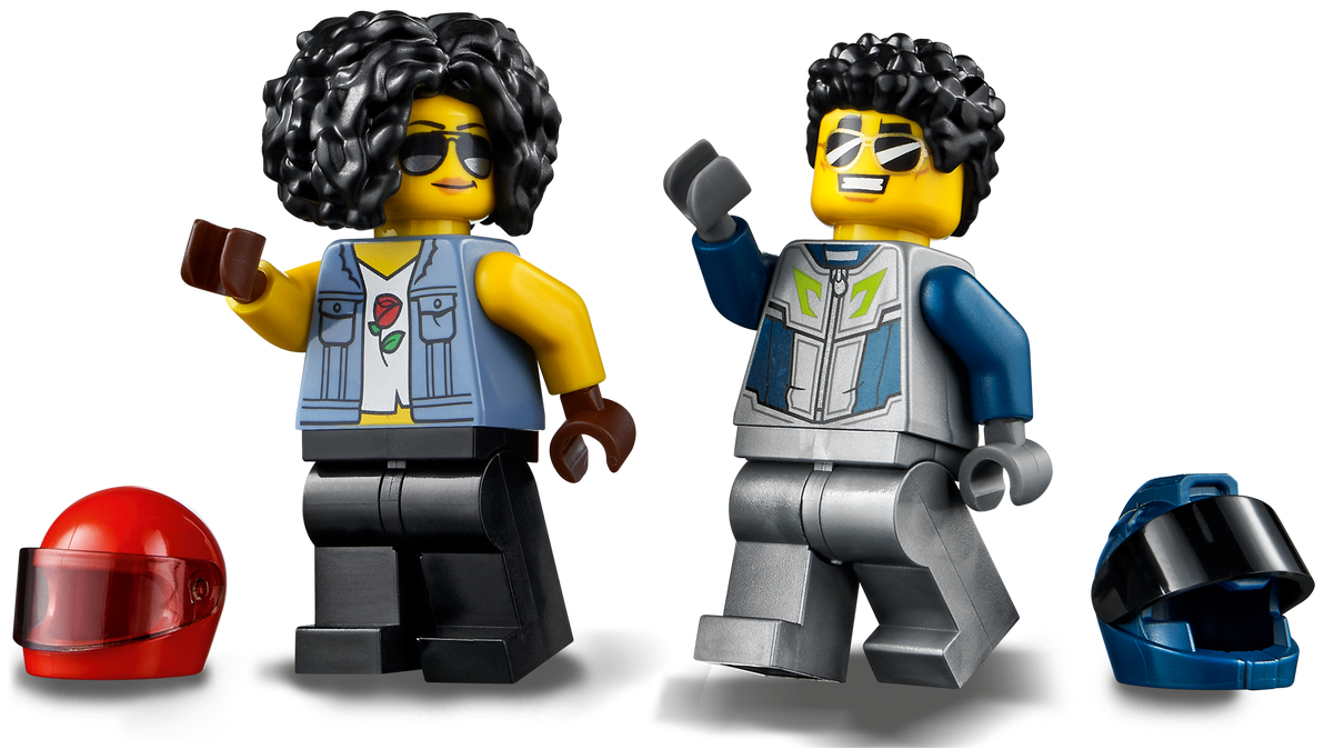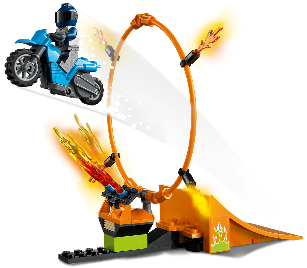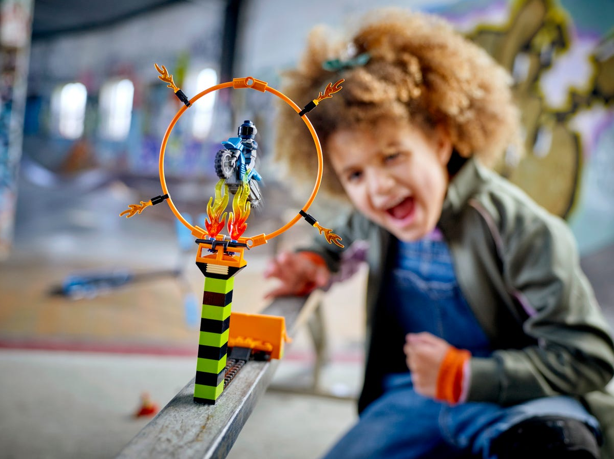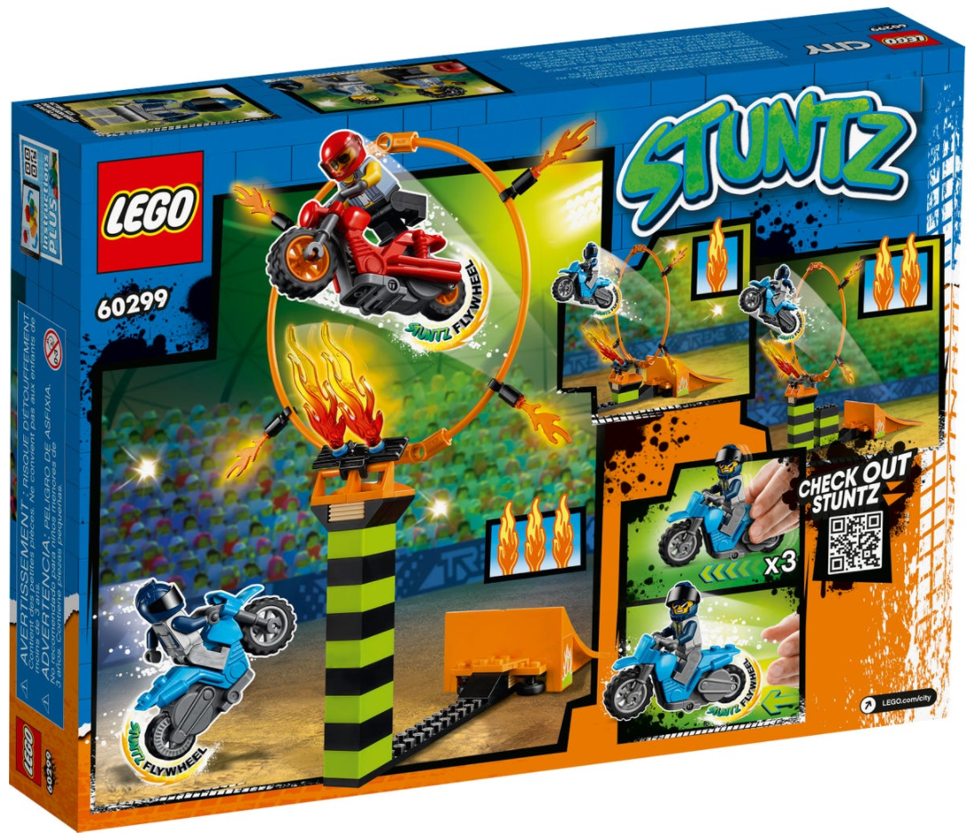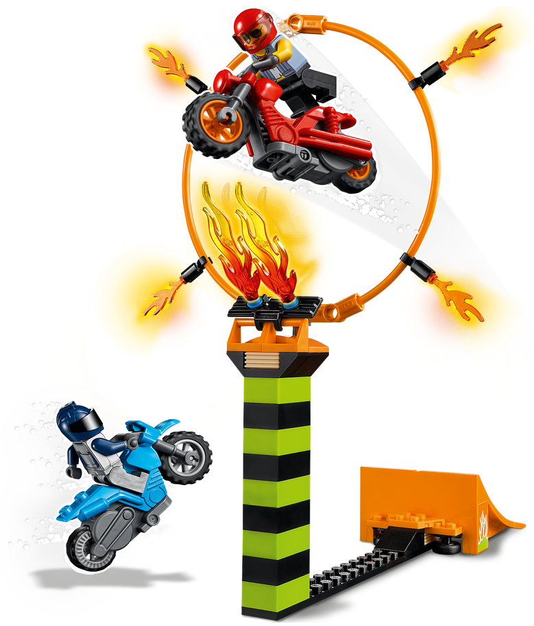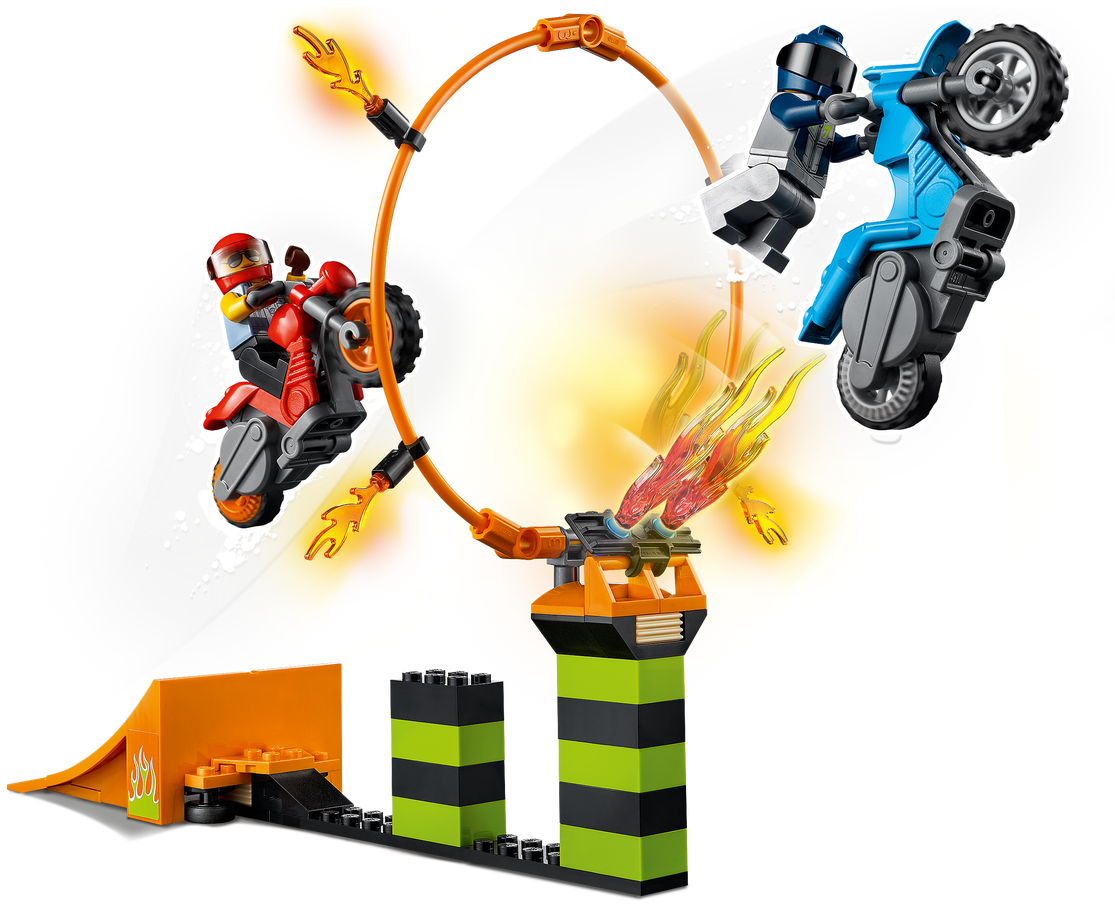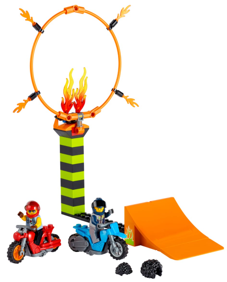 - Co jest w środku? Płonąca obręcz, wieża z regulowaną wysokością, płomienie LEGO® do zbudowania, dwa motocykle kaskaderskie napędzane kołem zamachowym oraz dwie minifigurki motocyklistów, w tym Duke DeTain z serialu telewizyjnego LEGO City.
