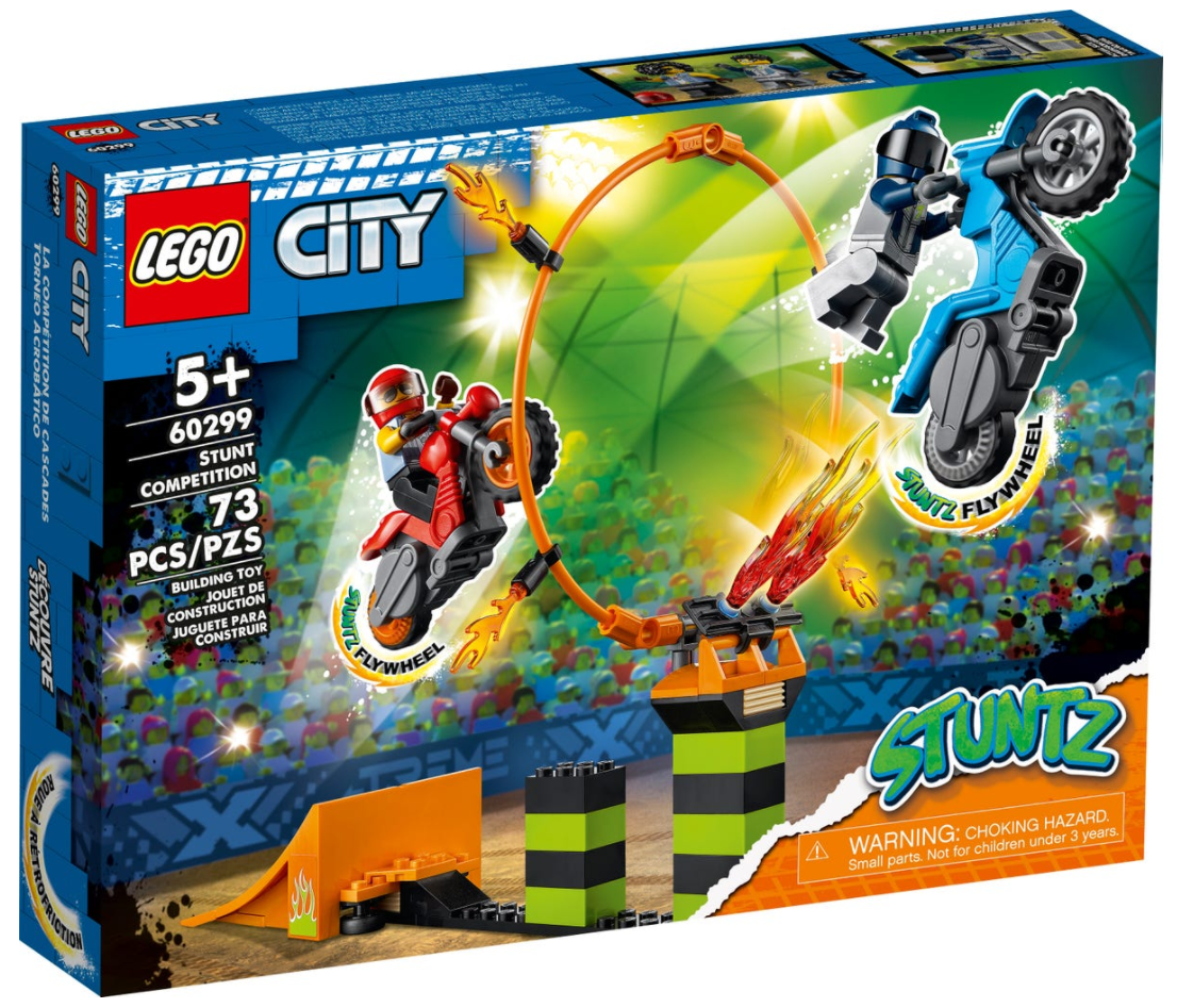 - Pełen akcji zestaw LEGO® City Konkurs kaskaderski (60299) z dwoma motocyklami napędzanymi kołem zamachowym, torem kaskaderskim oraz dwoma motocyklistami, w tym bohaterem serialu telewizyjnego LEGO City.