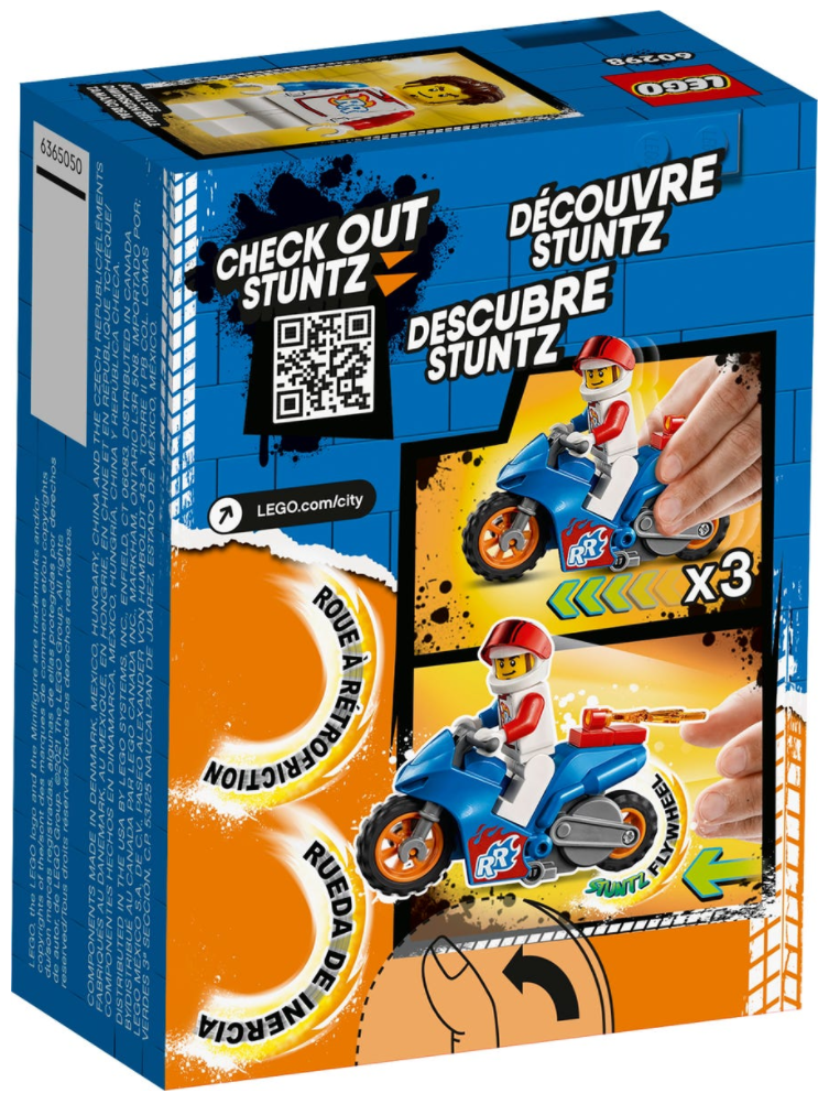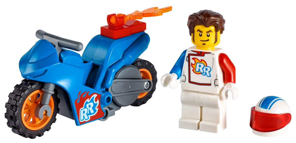 - Co jest w środku? Wszystkie elementy potrzebne do zbudowania superfajnego motocykla kaskaderskiego napędzanego kołem zamachowym oraz minifigurka Rocket Racera — postaci z serialu telewizyjnego LEGO® City Adventures.