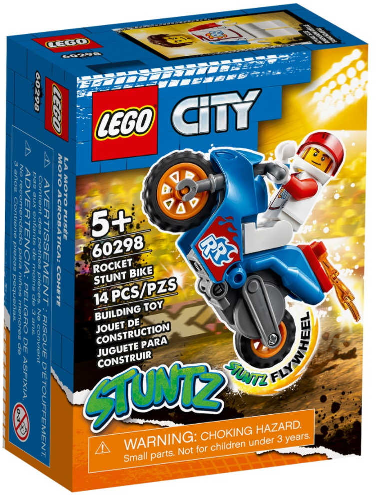 - Zestaw LEGO® City Rakietowy motocykl kaskaderski (60298) pozwoli wyobraźni dzieci wznieść się na wyżyny podczas zabawy motocyklem napędzanym kołem zamachowym oraz minifigurką brawurowego Rocket Racera z serialu telewizyjnego LEGO City.