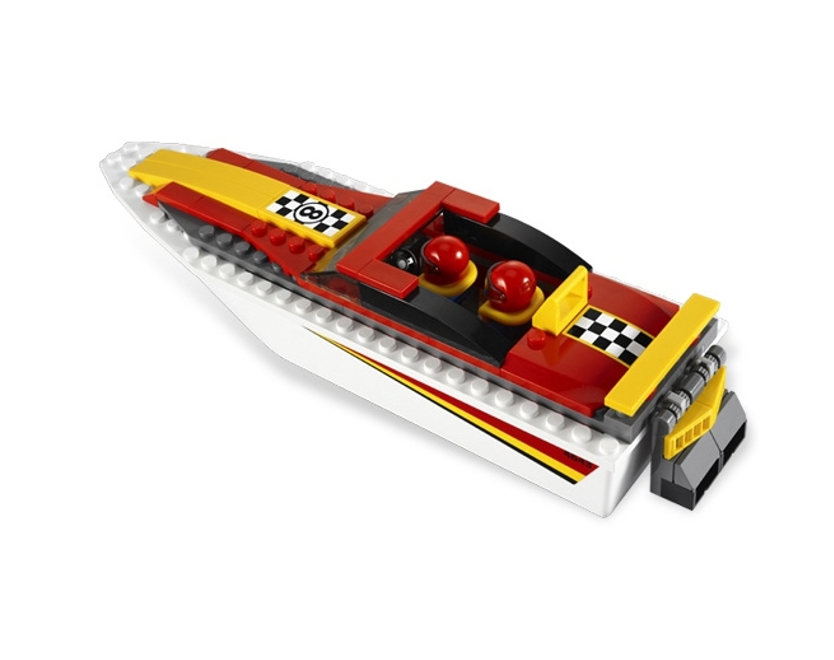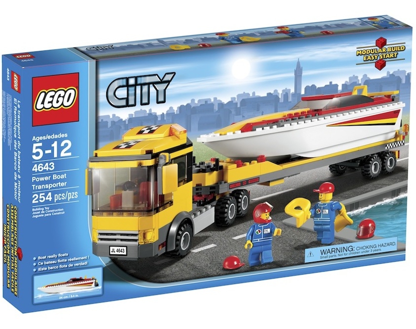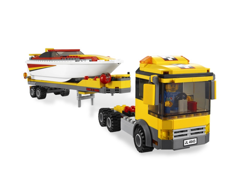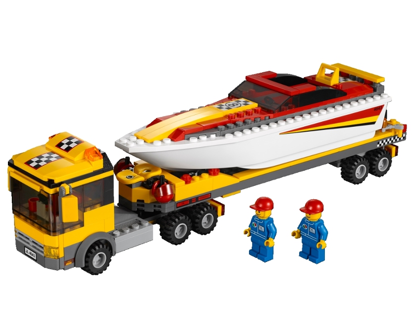 Transporter motorówek z serii Lego City. Zbliżają się wyścigi i trzeba przewieźć motorówkę nad morze specjalną lawetą. Ciężarówka ma 30 cm, a motorówka 20 cm długości.
