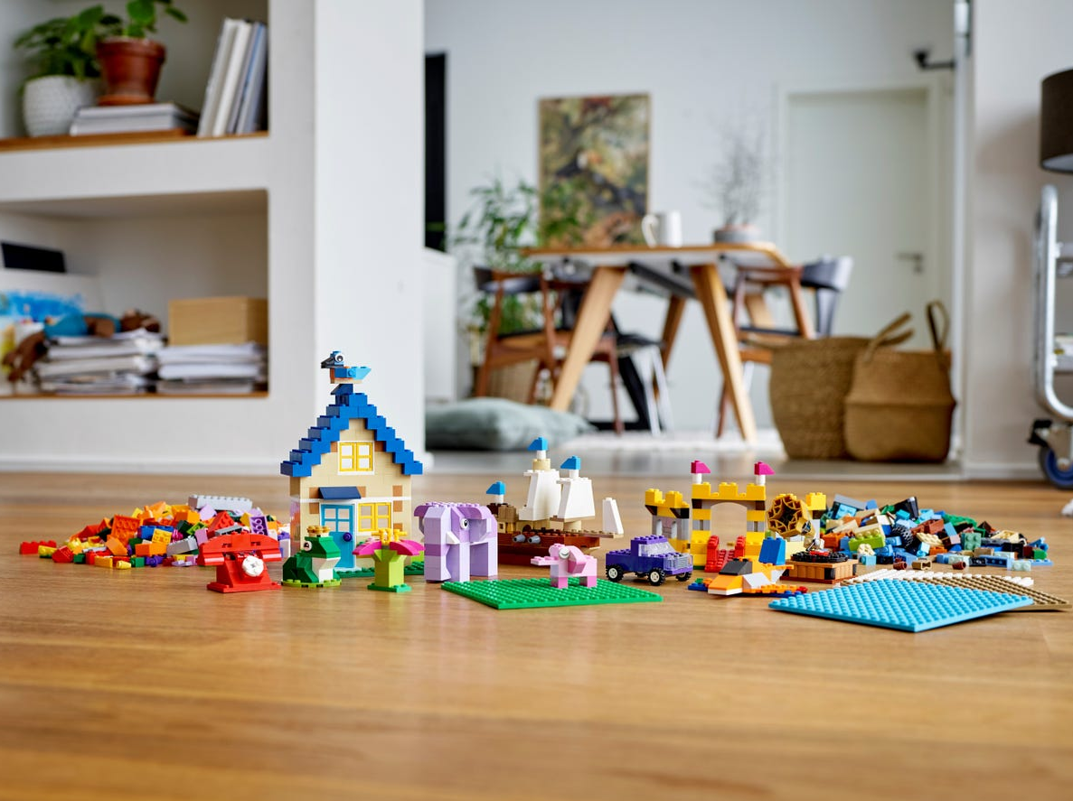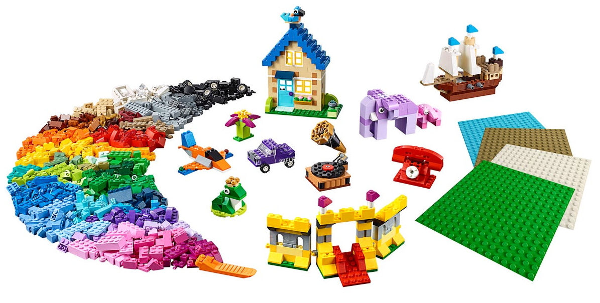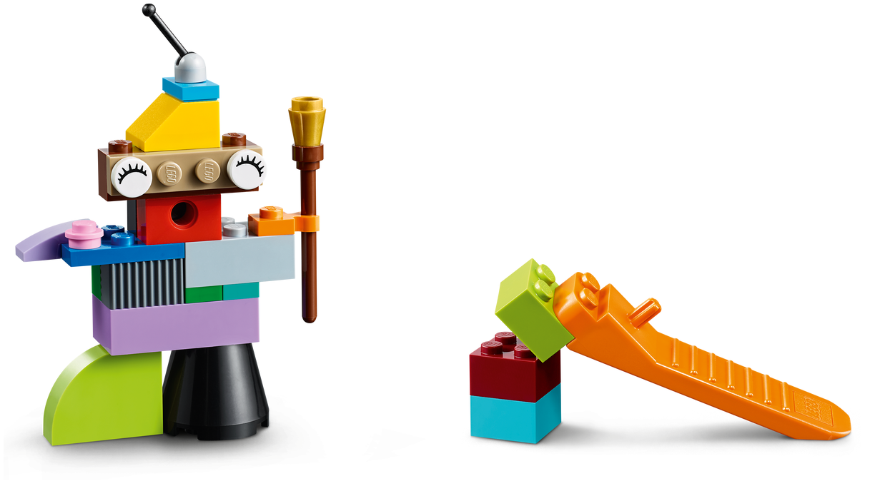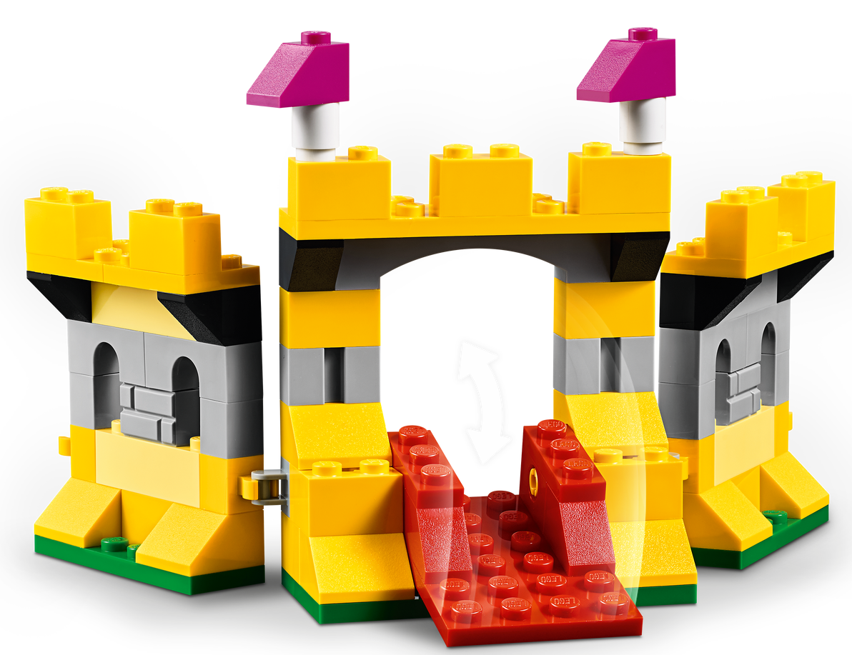 Z bogatej gamy kolorów i kształtów — takich jak koła, okna, drzwi i oczy — oraz czterech płytek konstrukcyjnych w rozmiarze 16x16 dzieci mogą stworzyć wszystko, co przyjdzie im do głowy. Przejrzyste instrukcje pozwolą im natychmiast zabrać się za budowanie prostych modeli LEGO, na przykład żaby, statku pirackiego, słonia lub zamku. Z klocków w zestawie można złożyć też własne niezwykłe dzieła, z łatwością przyczepiając je do płytek konstrukcyjnych i zdejmując z nich — i to pod dowolnym kątem, nawet do góry nogami. Dzięki temu płytki świetnie nadają się do przenoszenia i przechowywania ukończonych modeli.