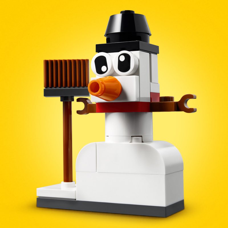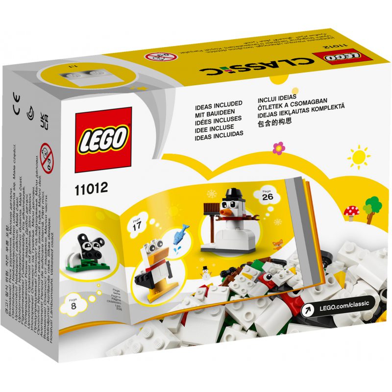 Zestaw LEGO® Classic Kreatywne białe klocki (11012) jest pełen pomysłów i inspiracji, które rozwiną kreatywny potencjał dzieci. Młodym budowniczym od 4 lat spodobają się trzy łatwe do zbudowania modele LEGO: bałwanek śniegowy z miotłą, owca na kwiecistej łące oraz mewa z rybą. Pomysłowa zabawa może trwać bez końca — wystarczy wymieszać klocki i przerobić modele albo zbudować z nich coś innego.