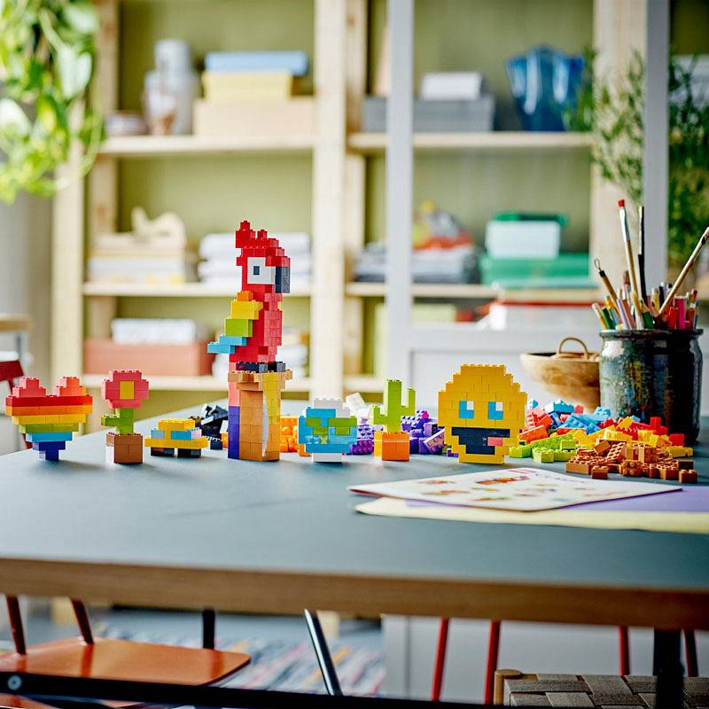 Zestaw zawiera wiele klocków LEGO w żywych kolorach – szczególną uwagę zwraca oryginalny i bardzo popularny klocek 2x4! Zestaw zawiera czytelne, drukowane instrukcje budowania zabawnych modeli, w tym samochodu, globusa, kwiatka, serca, gitary, domu, emoji, papugi, psa i jabłka. Ten zestaw ma zachęcać do swobodnej, kreatywnej zabawy. Zawiera nawet broszurę pełną instrukcji budowania i sugestii dla młodych budowniczych. Cyfrowe instrukcje można również znaleźć w aplikacji LEGO Builder.