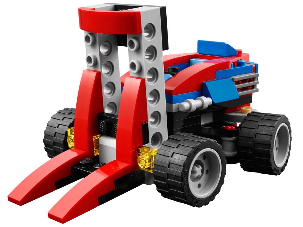 Model typu 3 w 1: możliwość zbudowania efektownego quada lub potężnego wózka widłowego. W wózku widłowym można umieścić minifigurkę. Zawiera działający, widoczny mechanizm układu kierowniczego, duży silnik z kratką wlotową i rurą wydechową oraz szerokie felgi z grubymi oponami