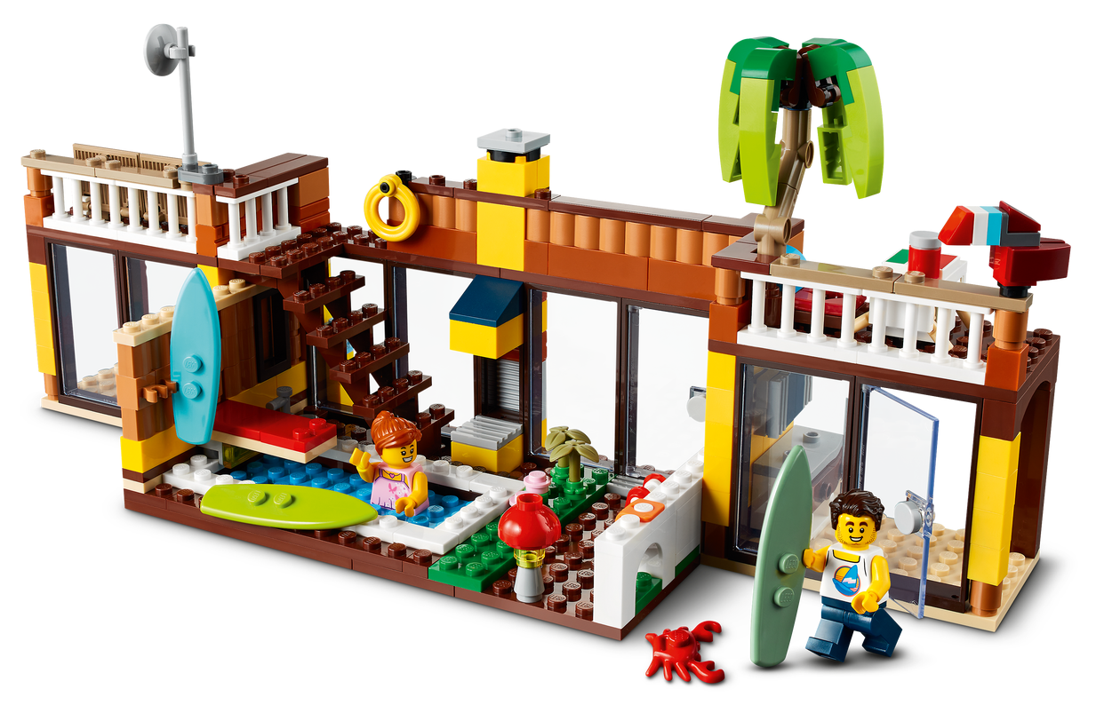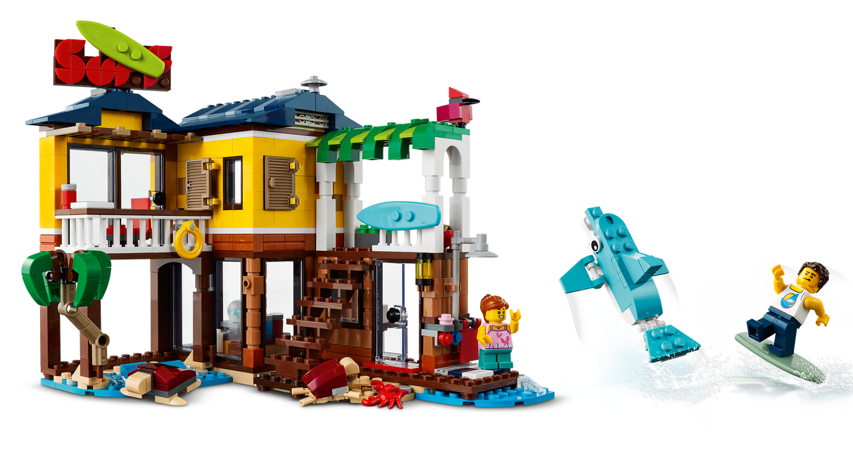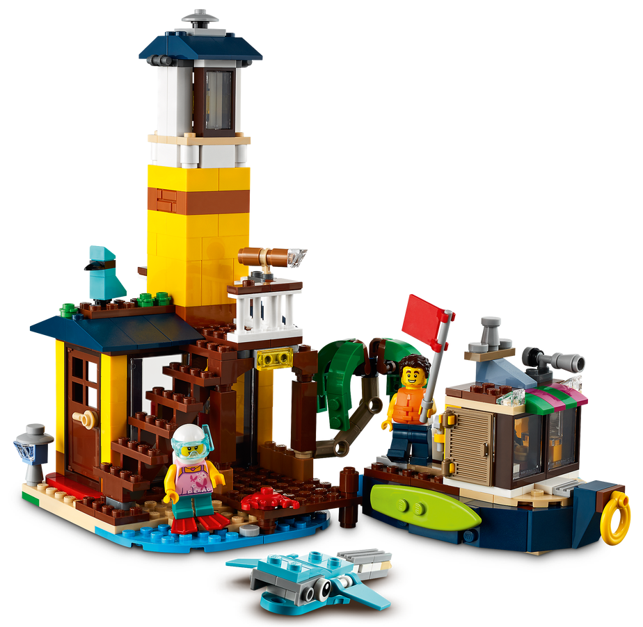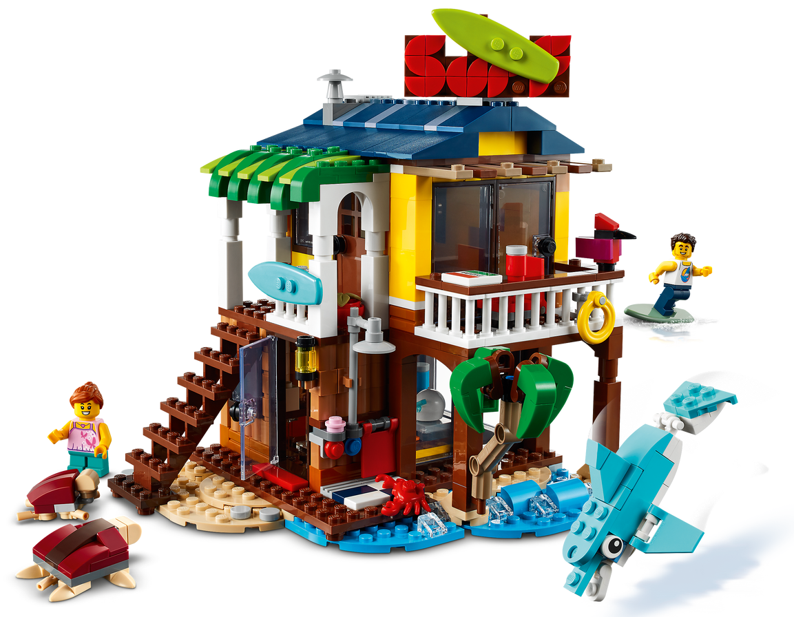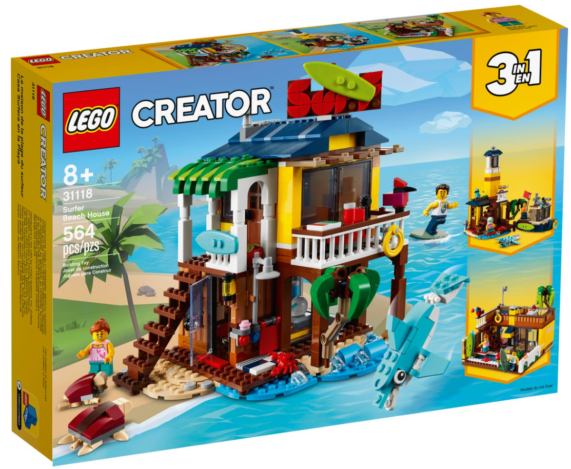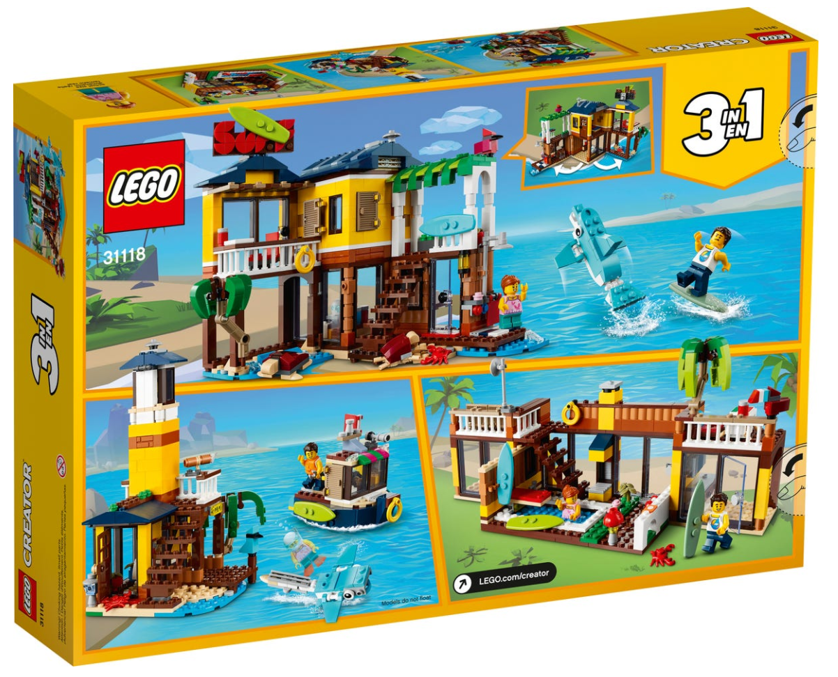 - Zestaw LEGO® Creator 3 w 1 Domek surferów na plaży (31118) przykuje uwagę dzieci na wiele godzin. Jeden komplet klocków pozwala zbudować trzy modele: domek surferów, latarnię morską i dom z basenem.