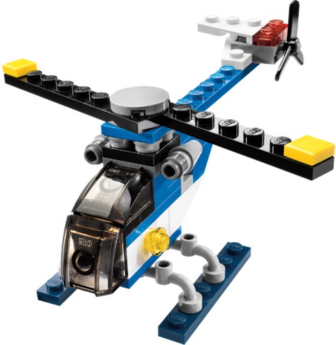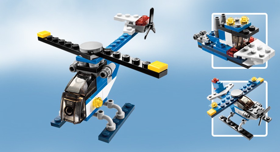 Mały helikopter 3 w 1 z serii Creator. Niech nie zwiedzie Was jego mały rozmiar, ten zestaw może dostarczyć mnóstwo zabawy. W formie podstawowej otrzymujemy helikopter. Dodatkowo w zestawie znajduje sie instrukcja złożenia samolotu i statku.