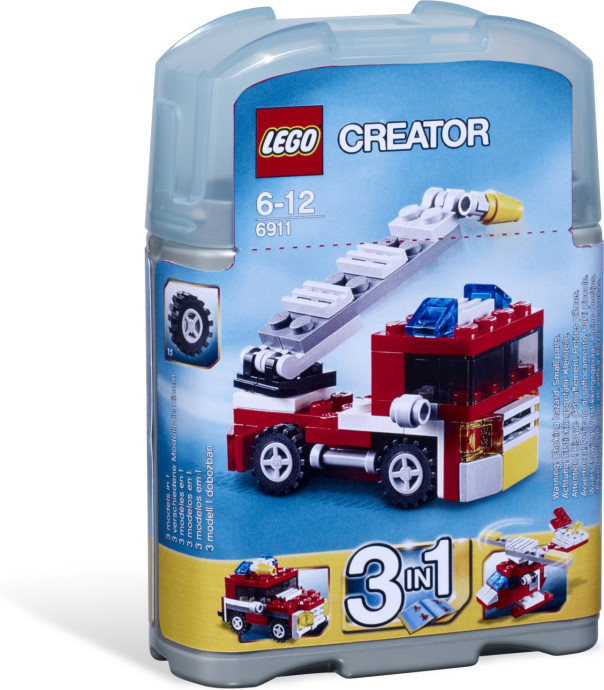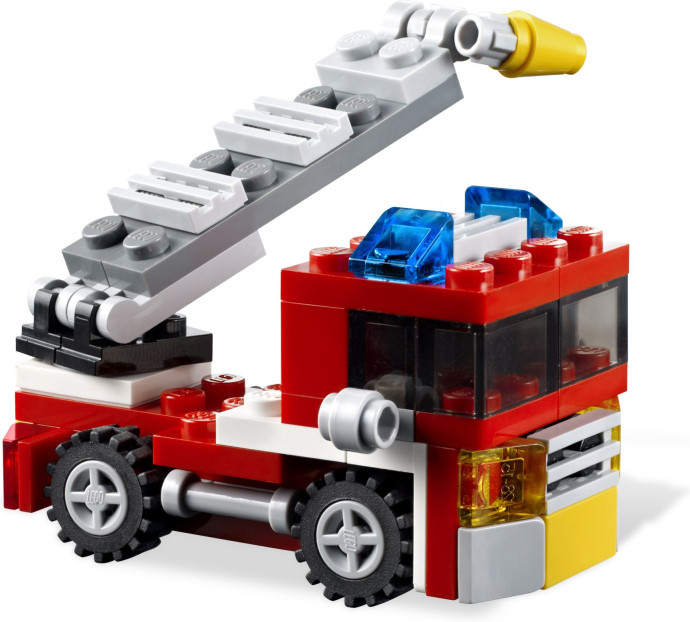 Mały wóz strażacki 3 w 1 z serii Lego Creator już pędzi na ratunek! Zgaś każdy pożar małym wozem strażackim wyposażonym w ruchomą drabinę i żółty wąż strażacki! Możesz go też przerobić na samochód terenowy dowódcy straży pożarnej lub helikopter strażacki. Zestaw znajduje się w wygodnej puszce do wielokrotnego użycia. W środku znajduje się także broszura, a w niej łatwe do wykonania konstrukcje i inne inspirujące pomysły.