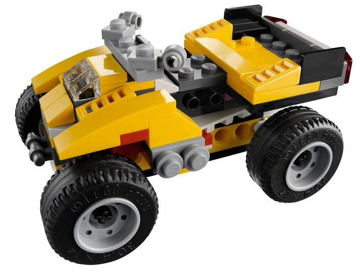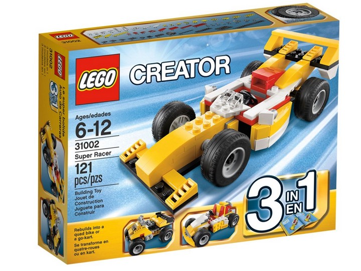Samochód Wyścigowy 3w1 31002 Lego Creator gotowy do startu! Mknij po torze w superszybkim samochodzie wyścigowym! Duże, zgrabne koła, spojlery i niezwykle opływowy kształt pozwolą Ci wygrać każdy wyścig. Obracaj kierownicą i pokonuj trudny teren dzięki oponom z prawdziwej gumy! Potem przebuduj żółty samochód wyścigowy na dwa inne pojazdy: wytrzymały quad lub zwinny go-kart.