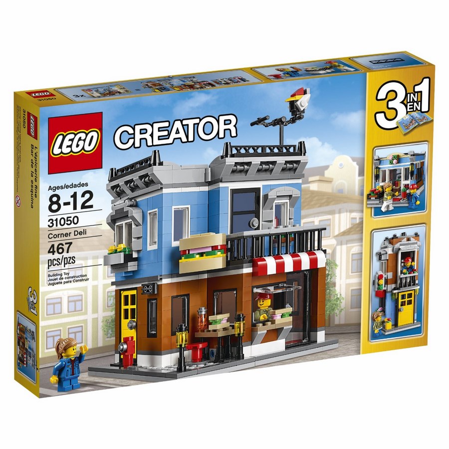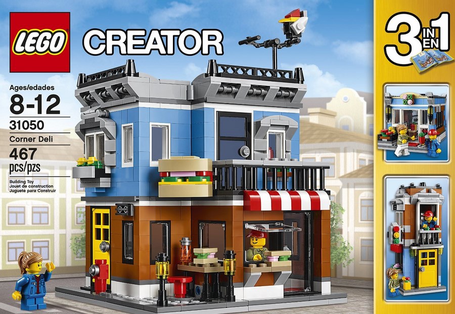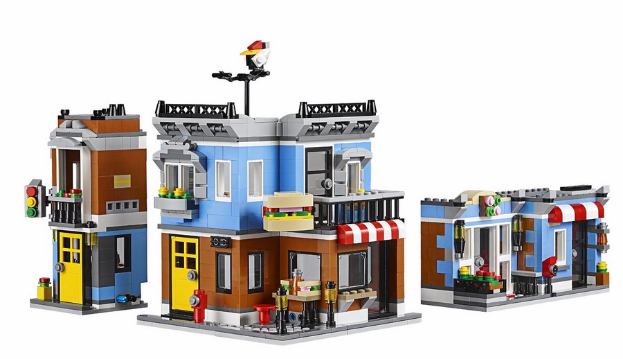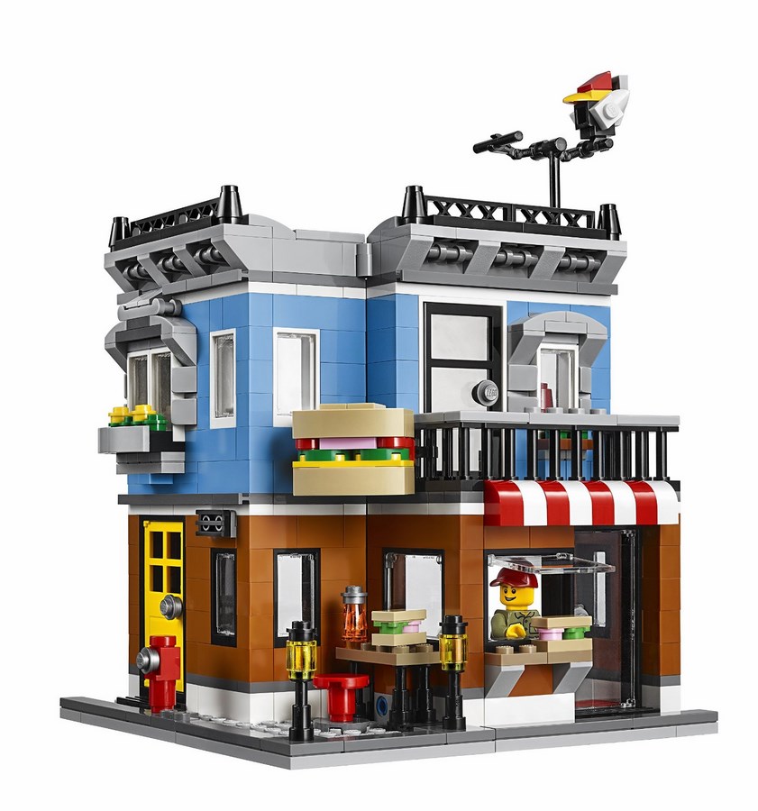 Otwórz własne delikatesy! Wejście osłonisz markizą w czerwono-białe paski, a fasada w jasnych barwach plus oryginalny znak w kształcie kanapki przyciągną klientów. Późnej wejdź do przytulnej kuchni i przygotuj kanapki. Głodni klienci już ustawiają się w kolejkach przed dużymi okienkami. Chętnie przegryzą coś na chodniku, między hydrantem a ulicznymi latarniami! Czas na przerwę? Schody zaprowadzą cię do mieszkanka na piętrze. Znajdziesz tam mięciutki fotel, lampę oraz wyjście na balkon i dachowy taras. Z klocków w tym zestawie możesz też zbudować modele alternatywne — małą kamieniczkę albo kwiaciarnię.