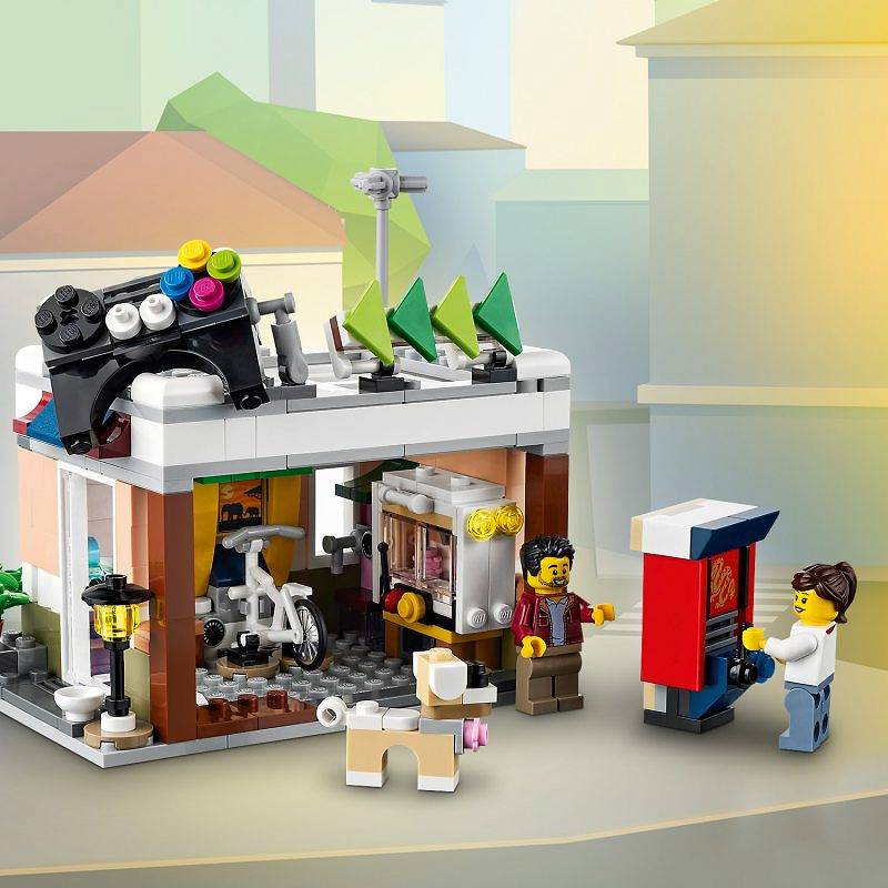 Ten zestaw konstrukcyjny LEGO Creator 3 w 1 pozwala dzieciom zbudować trzy różne modele budynków. Pociechy mogą zacząć od złożenia dwupoziomowej kamienicy ze sklepem z kluskami, mieszkaniem i tarasem na dachu, a potem przekształcić budynek w sklep rowerowy, stoisko z gazetami i studio artystyczne. Na koniec zestaw można przebudować w salon gier z trzema automatami. Oczywiście z 569 znajdujących się w zestawie klocków można też zbudować coś zupełnie innego.
