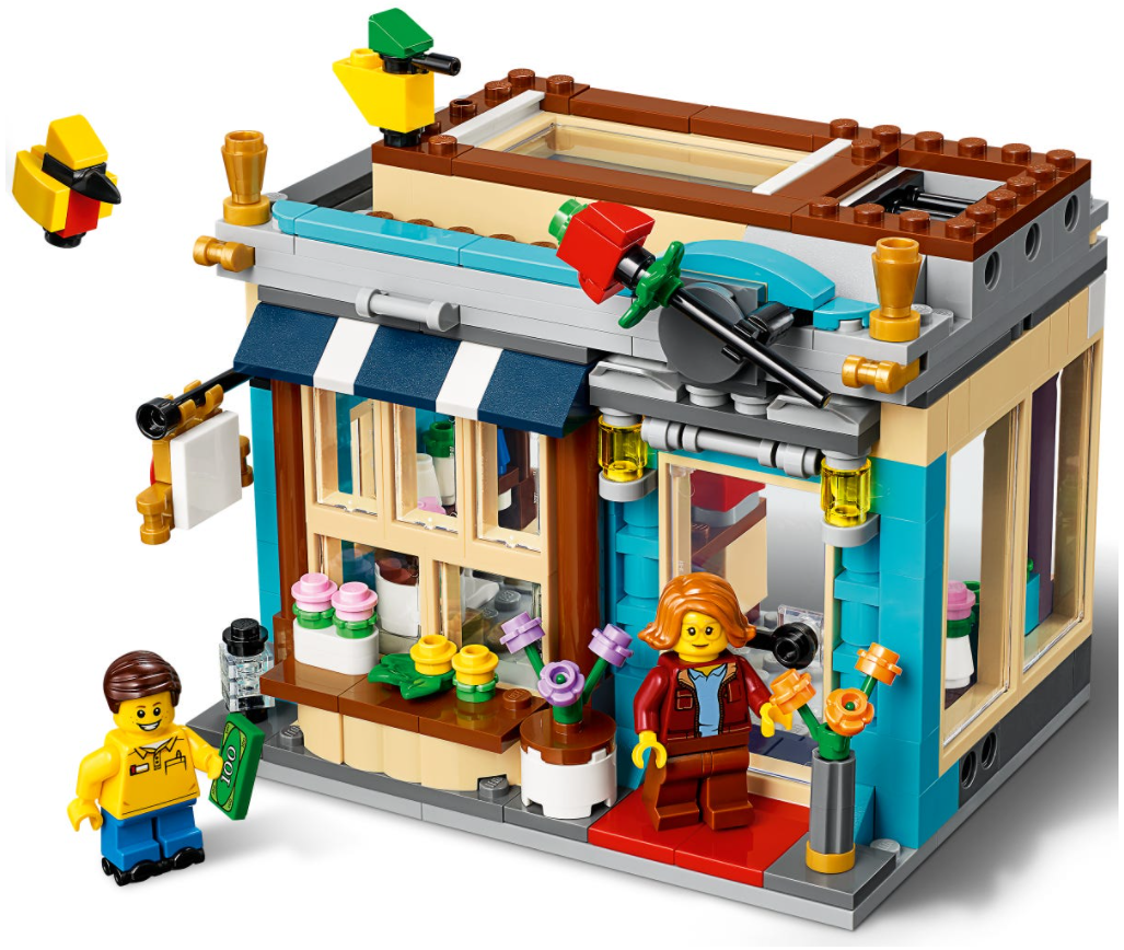 - Zestaw 3 w 1 to wyzwanie konstruktorskie dla dzieci. Mogą zbudować z niego kamienicę ze sklepem z zabawkami, cukiernię z warsztatem LEGO® albo kwiaciarnię ze świetlikiem, a dodatkowe atrakcje zapewnią im dwie minifigurki i figurka ptaka z klocków.