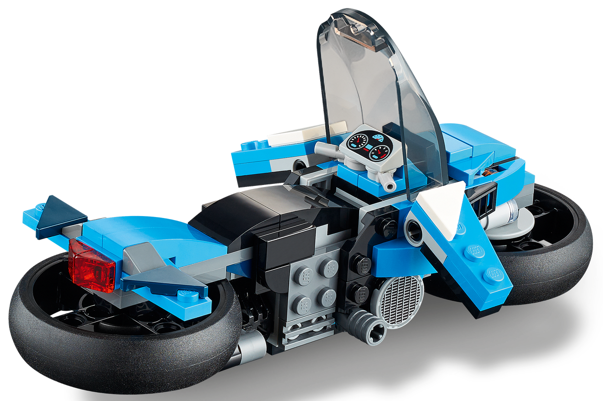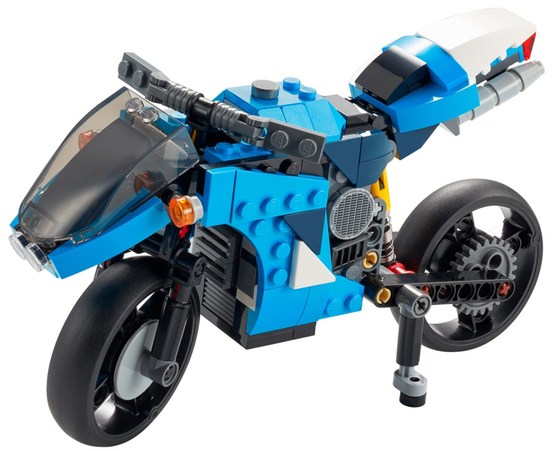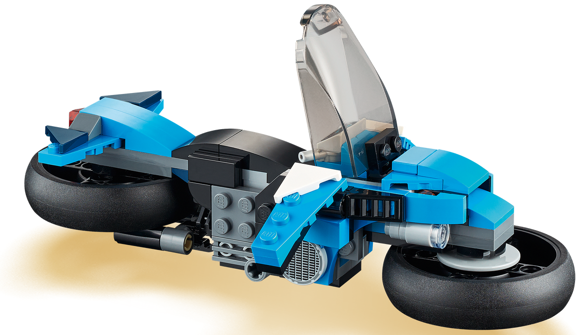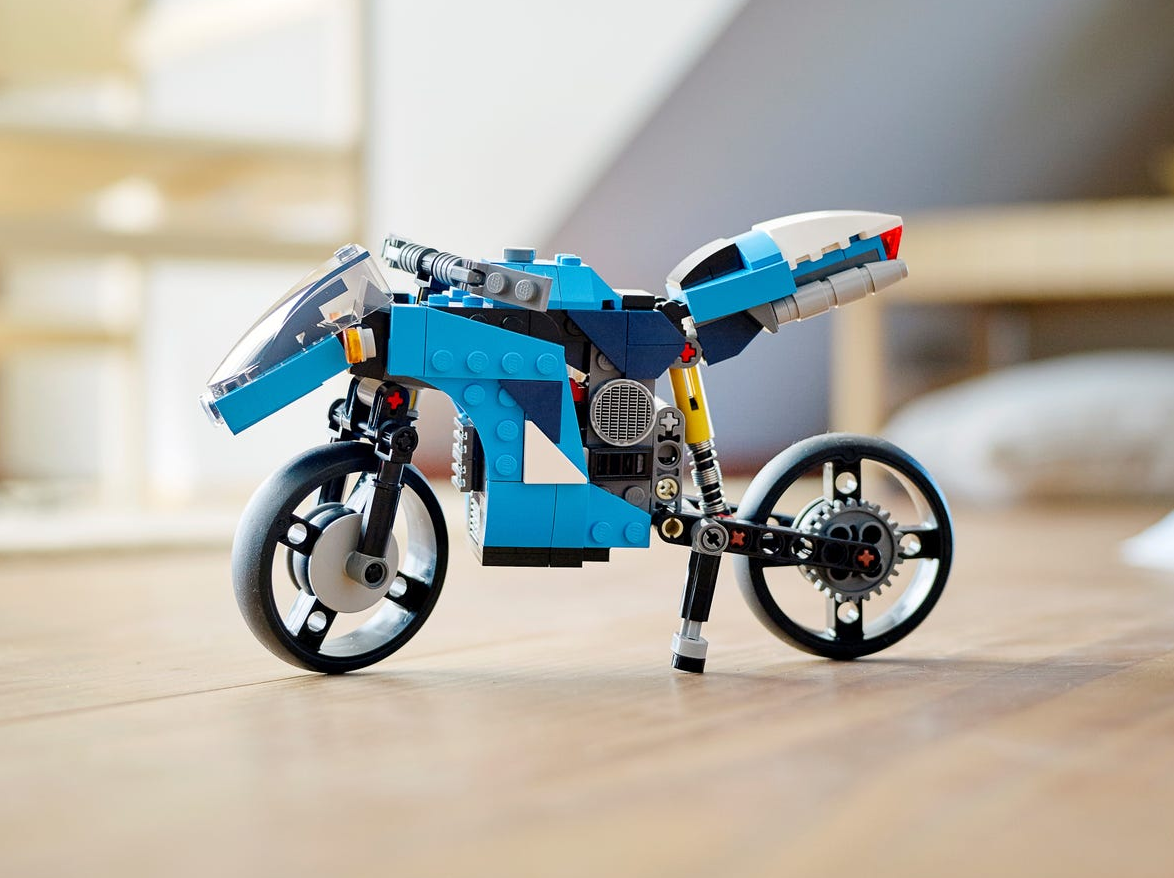 Ten zestaw LEGO Creator 3 w 1 to potrójna dawka budowania i zabawy. Dzieci mogą złożyć nowoczesny supermotocykl, a potem przerobić go na klasyczną maszynę lub futurystyczny latający motocykl, którym polecą szukać powietrznych przygód. Mogą też zbudować coś zupełnie innego — granicą jest tylko wyobraźnia!