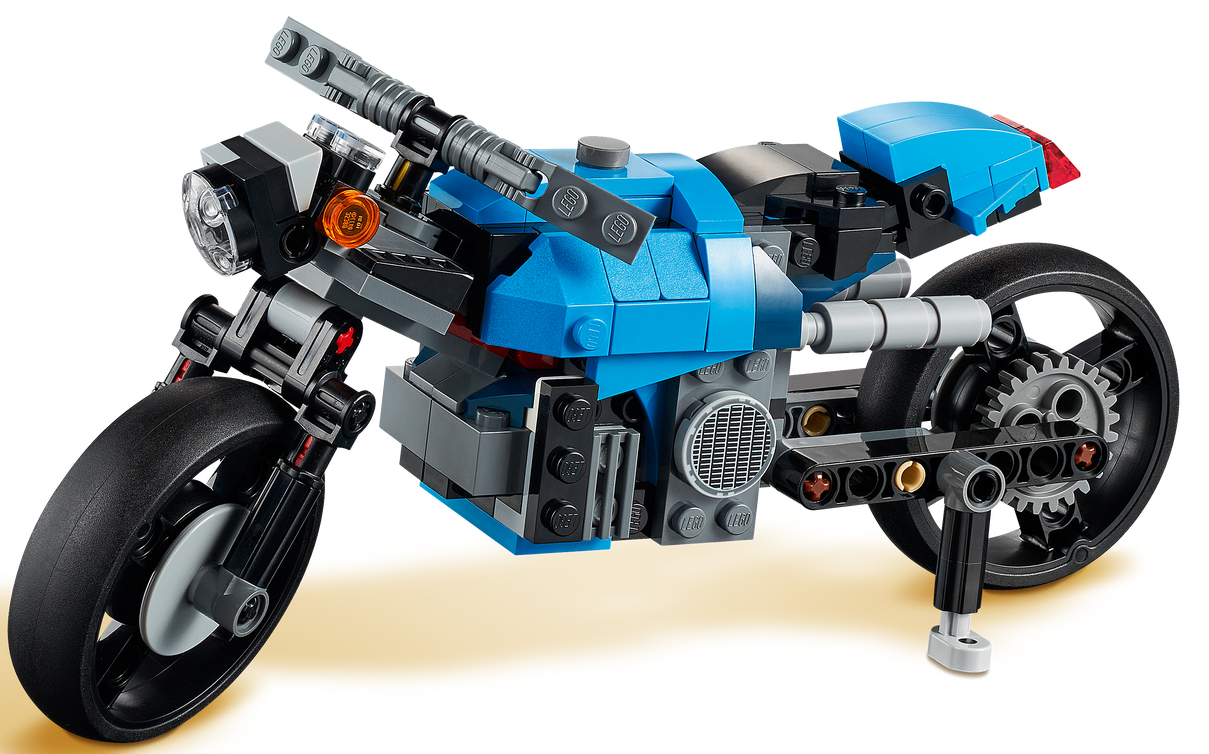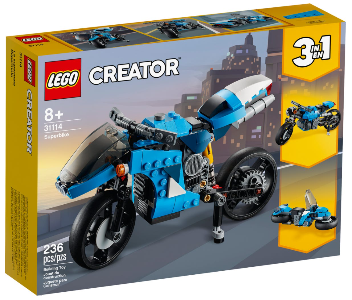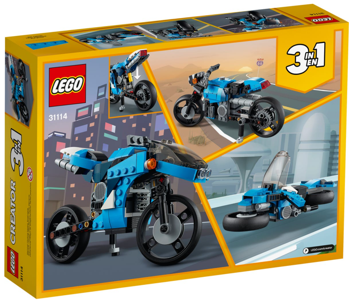 - Zestaw LEGO® Creator 3 w 1 Supermotocykl (31114) zachęca, by ruszyć wyobraźnią i oddać się budowaniu. Z klocków można zbudować trzy modele — nowoczesny motocykl, klasyczny motocykl oraz futurystyczny latający motocykl.