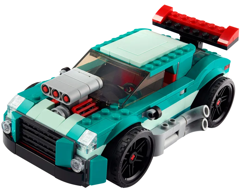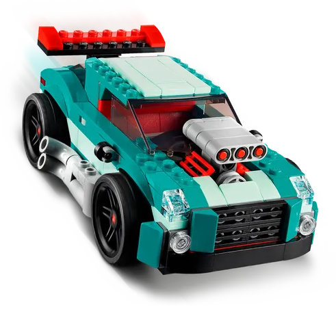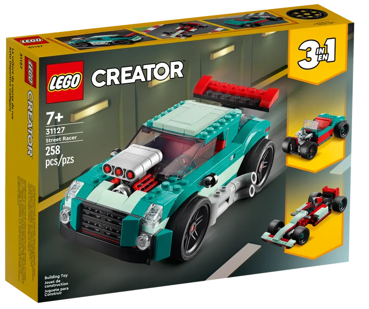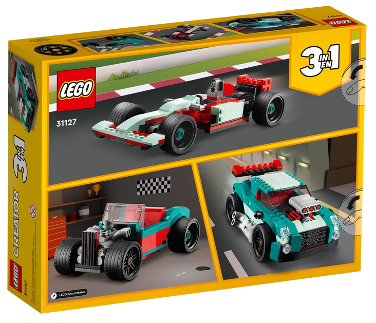 - Trzy zabawki w jednej — zestaw konstrukcyjny LEGO® Creator 3 w 1 Uliczna wyścigówka (31127) daje fanom samochodów nieograniczone możliwości zabawy w wyścigi dzięki trzem modelom do zbudowania: muscle carowi, samochodowi wyścigowemu i hot rodowi