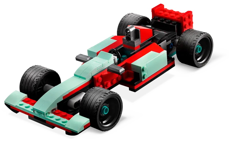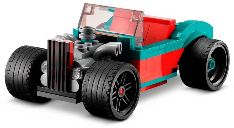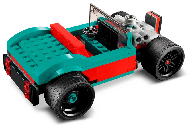 Ten zestaw LEGO® Creator 3 w 1 pozwala dzieciom zbudować trzy różne modele do zabawy. Ulicznego wyścigowego muscle cara można przebudować w samochód wyścigowy lub specjalnego czerwono-turkusowego hot roda. Pociechy mogą też użyć wyobraźni i stworzyć własne szybkie auto o dużej mocy.