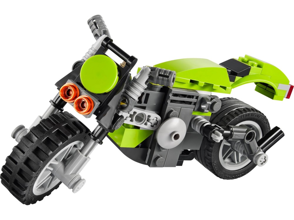 Ciesz się bezkresnymi przestrzeniami, przemierzając drogi jasnozielonym Zdobywcą autostrad. Ten efektowny motor ma długi, zakrzywiony przedni amortyzator, boczne lusterka, realistyczny silnik i dwie rury wydechowe. Gdy już nacieszysz się przejażdżką, możesz go przebudować na klasyczny motocykl lub wytrzymały motor terenowy.