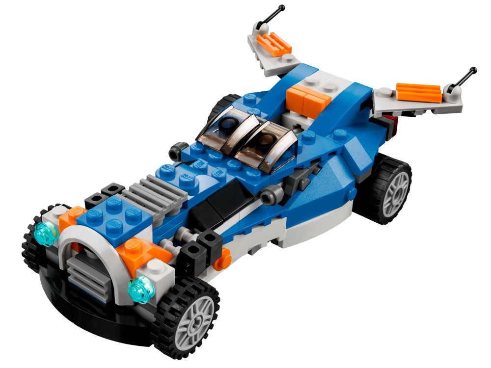 Z hukiem mknij po niebie w odrzutowcu zwanym zdobywcą przestworzy! Uruchom wielkie wloty powietrza, odpal potężne dopalacze i śmigaj w przestworzach na skośnych skrzydłach! Potem przebuduj model w wytrzymałego robota o ruchomych kończynach lub w futurystyczny, eksperymentalny samochód z zamontowanym pod kątem spojlerem i oponami z prawdziwej gumy.